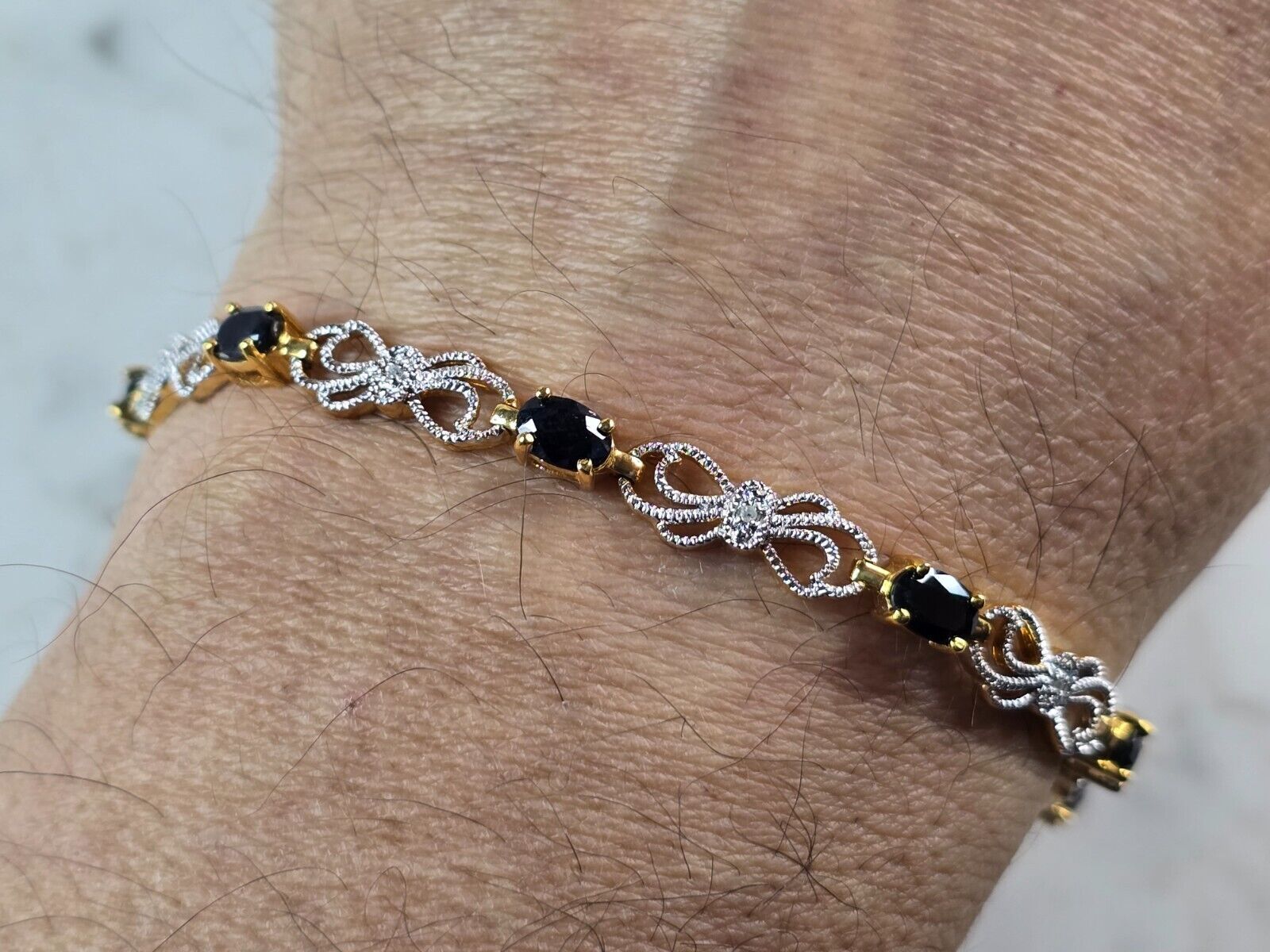 A WOMENS VINTAGE ESTATE STERLING SILVER GOLD TONE SAPPHIRE COLORED BRACELET . NOTE SURE IF STONE ARE NATURAL OR MAN MADE. BRACELET WEIGHS 10.5g, AND MEASURES 7 1/2" LONG BY 1/4" WIDE. MAKES A GREAT GIFT FOR THAT SOMEONE SPECIAL. ANY QUESTIONS, PLEASE ASK. BE SURE TO CHECK OUT OUR OTHER ITEMS FOR SALE.