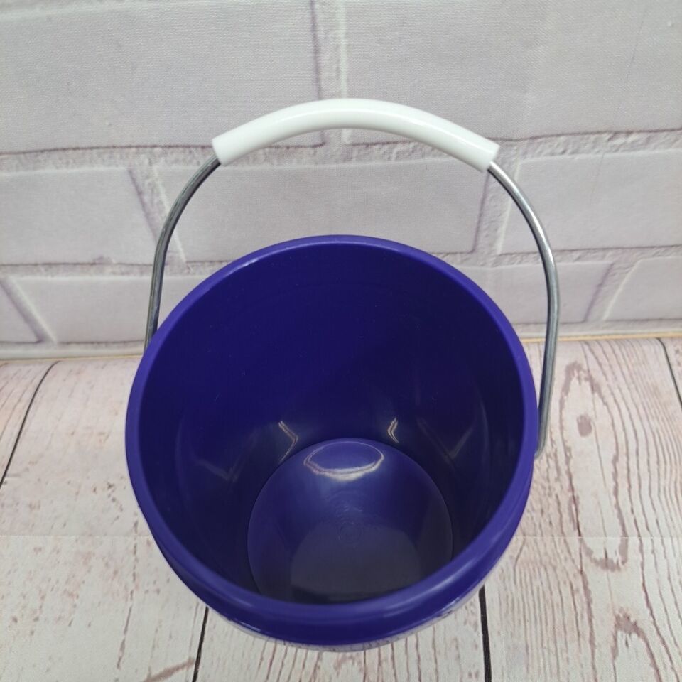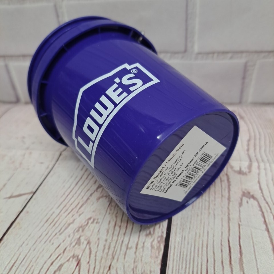 This is a new Lowe's Mini Bucket in blue, designed as a miniature paint pail. It has a capacity of .42 qt, stands 4 inches tall, and is made of plastic and metal. The bucket features a handle, is lightweight, stackable, and round in shape. It is branded by Lowe's and is part of the Lowe's Hardware franchise. This BPA-free item is ideal for various uses in kitchen, home, or barware settings.