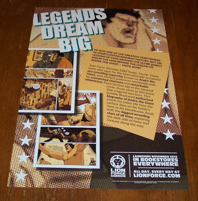 This is a WWF Wrestling Legends ANDRE THE GIANT PROMO POSTER PRINT. It Is NEW. It measures 11 X 17 inches. On a nice HEAVY STOCK paper. Would look AMAZING framed. It is a piece of art! Given out as a promo item at NEW YORK COMIC CON in 2015. Great for a Bedroom, Dorm Room, Office, Ect. Combine auctions to save on shipping. Made as a promotion for Lions Forge Comics for his official illustrated biography. Poster is Double Sided. DAD