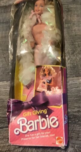 Gift Giving Barbie . She has a gift for you ! Presents for her friends too! . Original box has some signs of wear such as scratches and discolorations .Made in Malaysia .