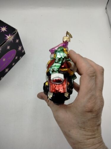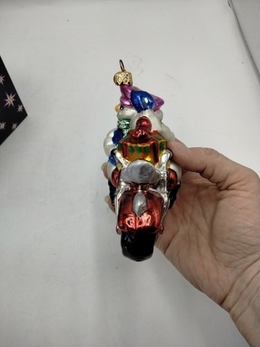 Crafted with care, this 2000 Radko Harley Davidson Chilly Rider ornament is made of glass and features intricate details that make it a true work of art. The ornament comes with its original box and can be hung easily to add a touch of holiday cheer to your tree. Perfect for collectors, this one-of-a-kind ornament is a great addition to any Christmas collection.