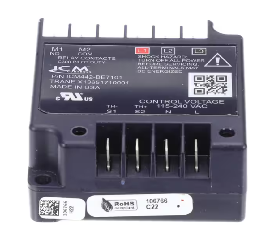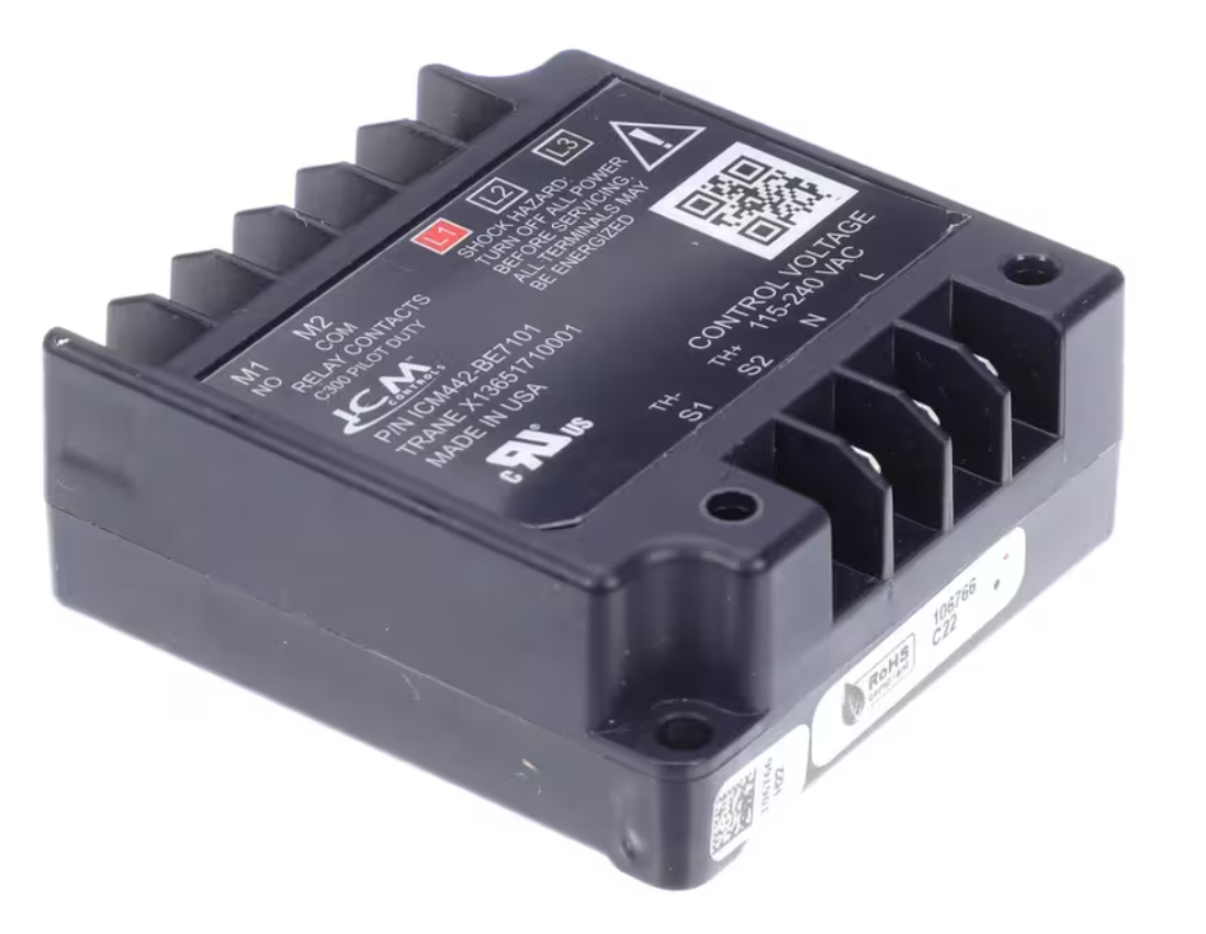 The Trane MOD03180 (ICM442-BE7101, X13651710001) is a line voltage and motor protection module engineered to safeguard 3-phase motors operating from 115 to 277 volts. This device protects against a range of electrical issues including phase loss, phase reversal, voltage imbalance, and under/overvoltage?ensuring the reliable operation of commercial HVAC systems and motors.