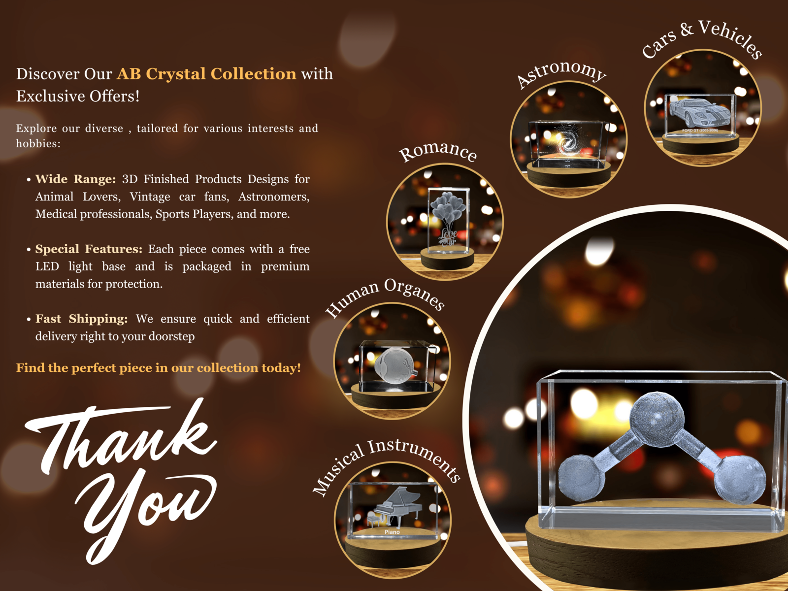First, our designers create a unique and detailed 3D model. Then, our skilled technicians etch the 3D model into crystal using advanced laser technology.