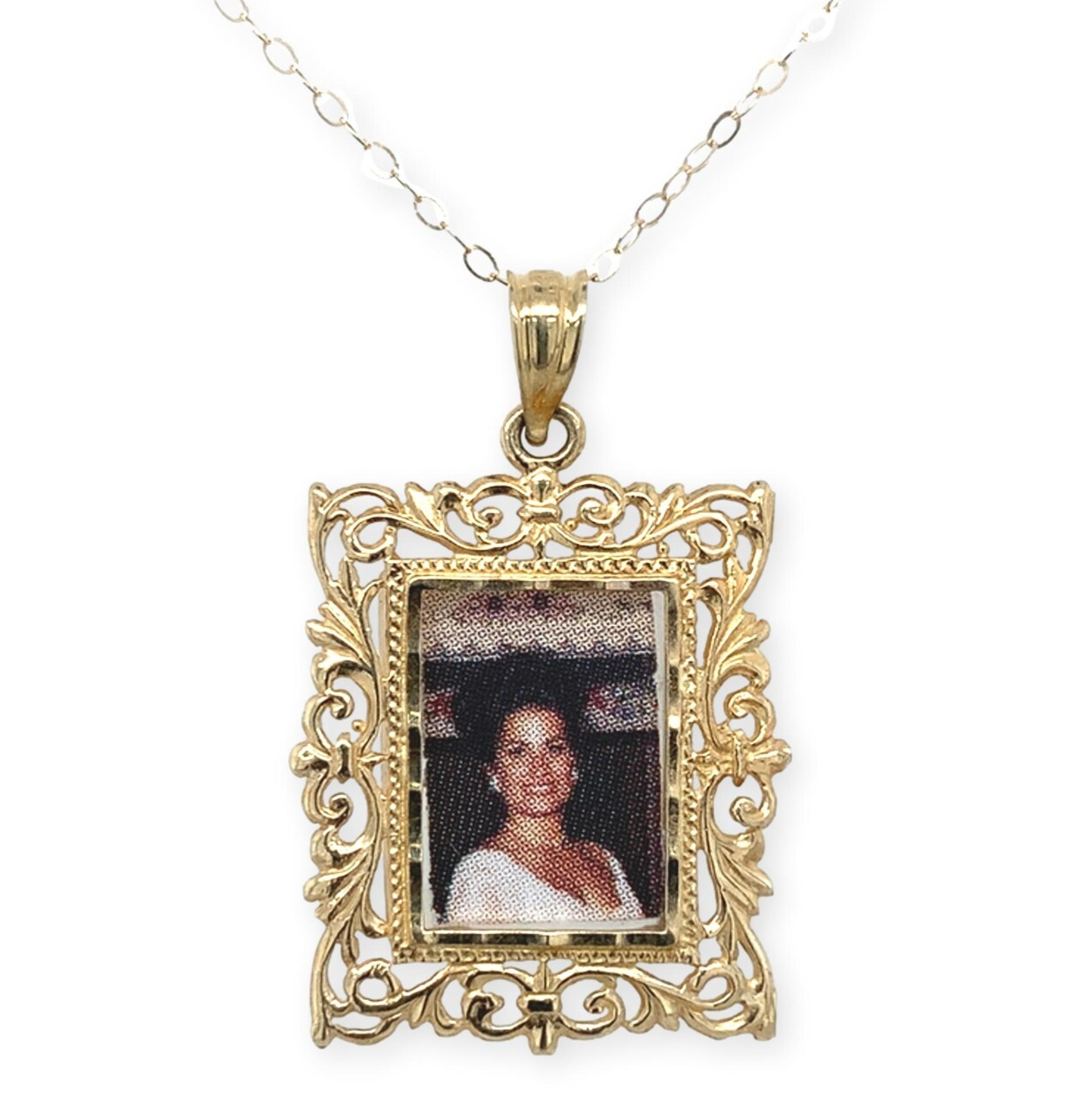 14k yellow gold picture frame pendant. The pendant measures 1" long with bail by 5/8" wide. The frame is made of scrolly filigree and will hold a photo that measures about 1/2" long by a little over 1/4" wide. The pendant includes a new 18" 14k yellow gold chain. The necklace weighs 1.27 dwt., and is contemporary. Wonderful!