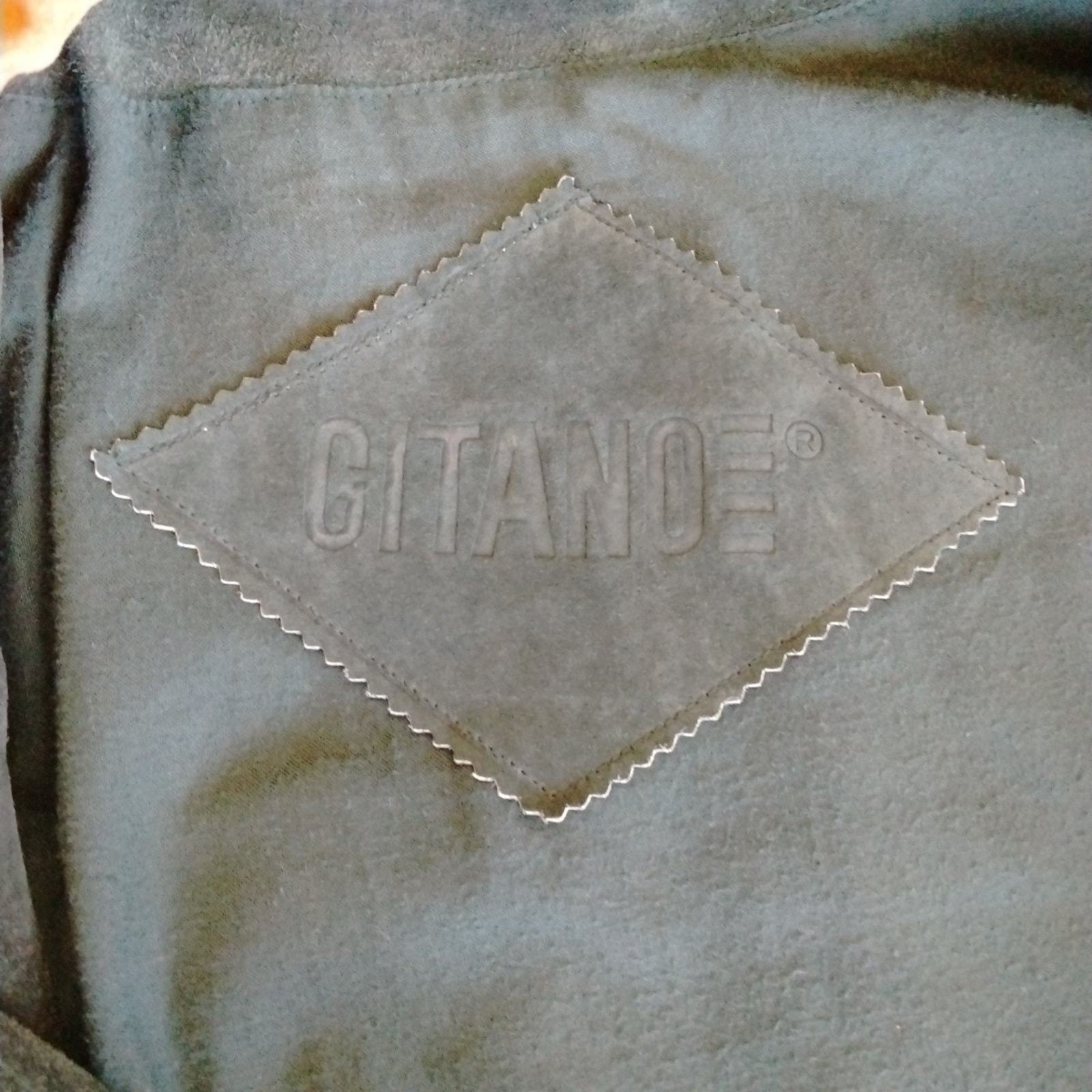 The Gitano men's jacket is a colorful vintage piece made of suede leather with a solid pattern. It features a zipper closure, two pockets, and a cotton lining. The jacket is midweight and suitable for all seasons, especially winter and fall. The black leather jacket has some brown shades and is perfect for casual occasions. TheGitano men's jacket is a polyester insulated overcoat with a zipper accent and a regular size type.
