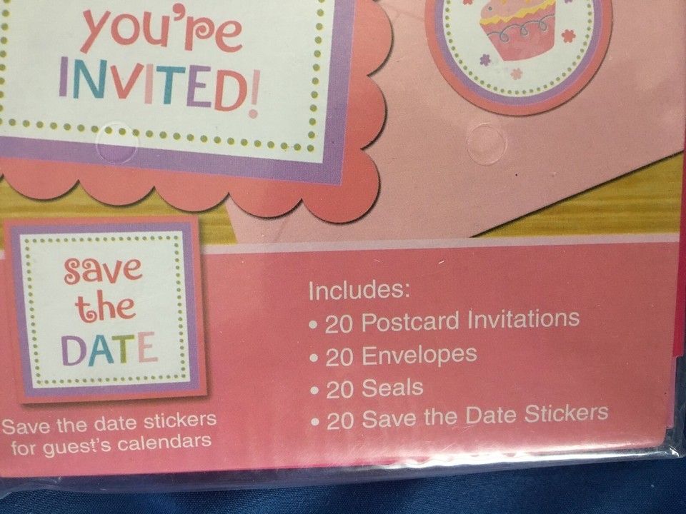 The pack is sealed. It contains 20 Postcard Invitations, 20 envelopes, 20 envelope seals and 20 Save the date stickers for calandars.