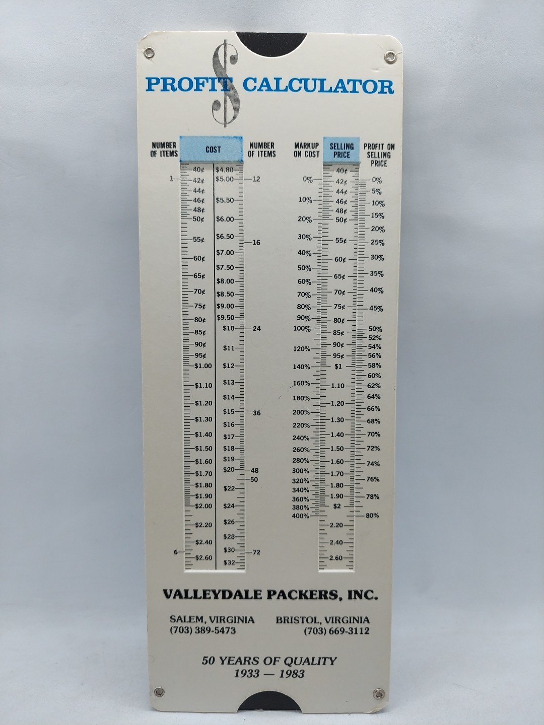 Vintage Valley dale Packers Products Profit Calculator Double-Sided Slide Chart