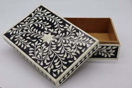 Add a touch of refined elegance to your vanity with this Heritage bone Inlay Jewelry Box in Black. Handcrafted by skilled Indian artisans, this piece features intricate mother of pearl inlay work, creating a delicate and timeless floral pattern that glistens softly against a warm beige background.