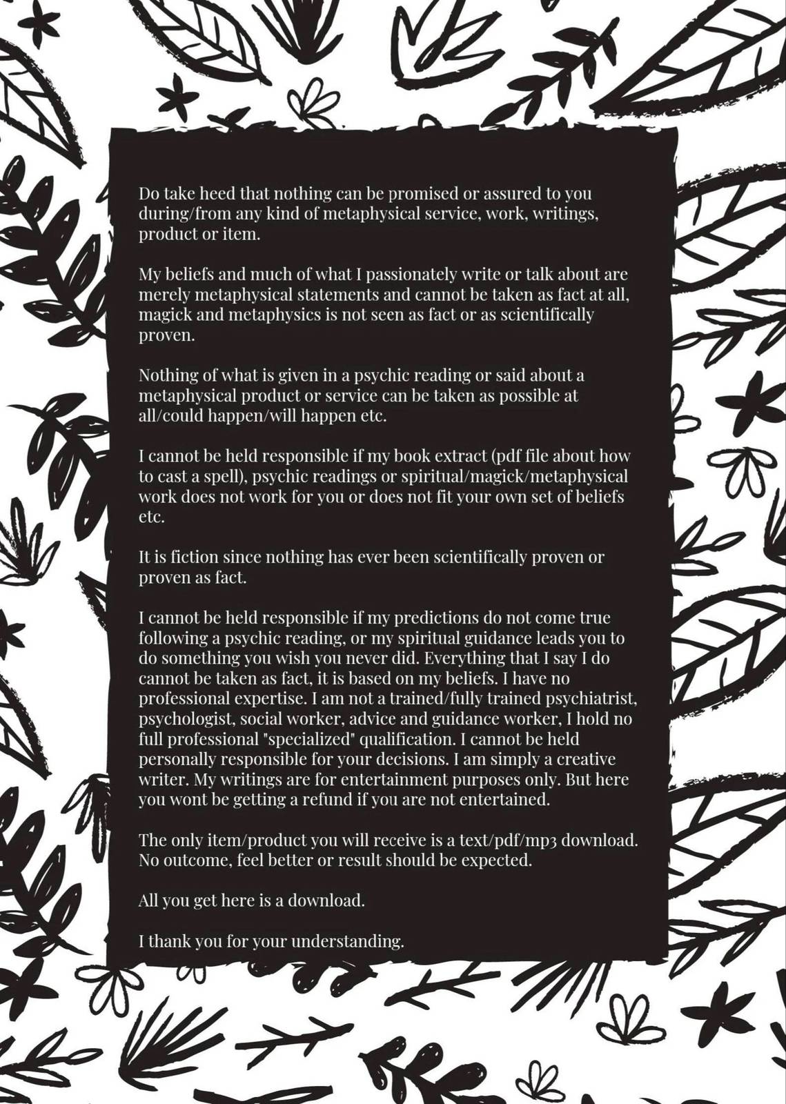 This hand-written creative Psychic Reading is purely for entertainment purposes. I exercise my freedom of expression, liberty, and creativity in writing about metaphysics. My writings are lighthearted, fictional, and as such are not serious or factual.