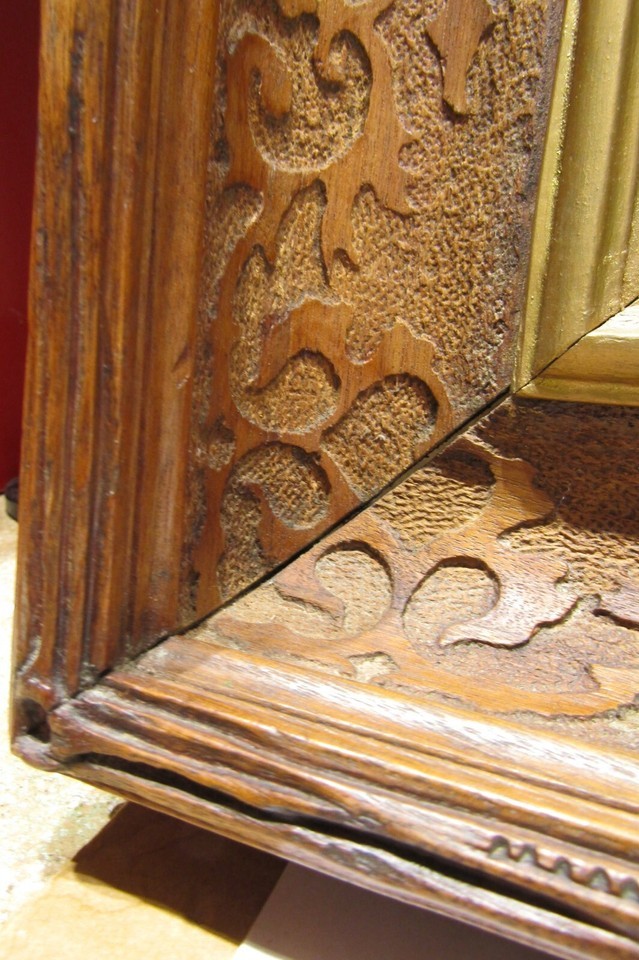 This beautiful hand carved wood mirror has an inner border of fine carved scrolling details and the outer edge has a faux bois design. The carvings are matched and continue alone the corners. It has a beveled antique mirror plate.