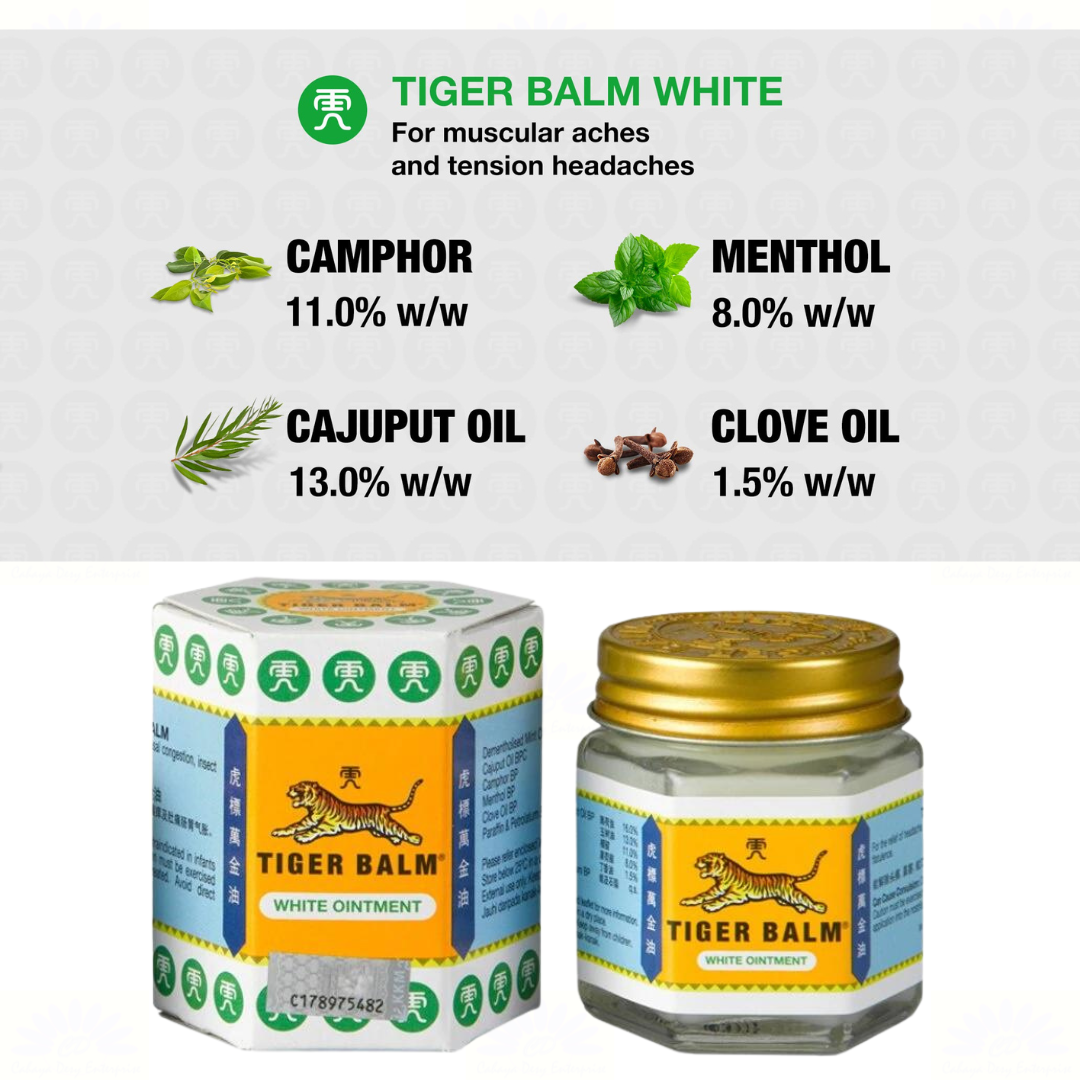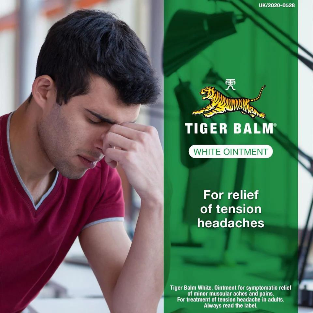 Tiger Balm White is a proven, safe and effective herbal ointment indicated for the treatment of tensions headache that you may get when your head, neck and shoulder muscles become tense due to tiredness, overwork or emotional strain.