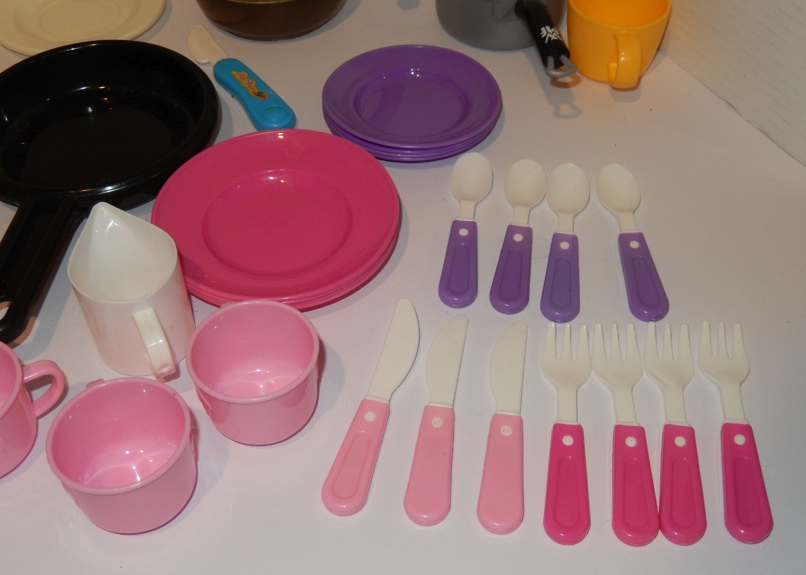 For Sale is a Huge Pretend Play dishes Utensils forks Lot 30 Items Pink Teal Yellow Purple. they are in good USED condition great for a pretend play kitchen. Please ask Any and All Questions prior to purchasing. Fast Same or Next day shipping with Free Delivery Confirmation within the U.S. Payment Due within 7 days of purchase (if you need more time please let us know In advance) we love to combine shipping is always a Yes and Most of the time Additional Items Ship for free.
