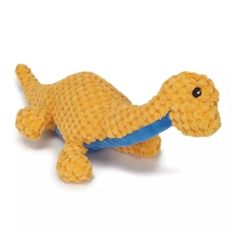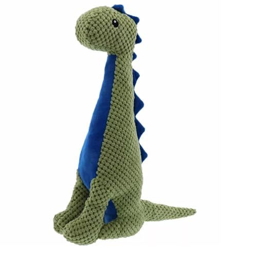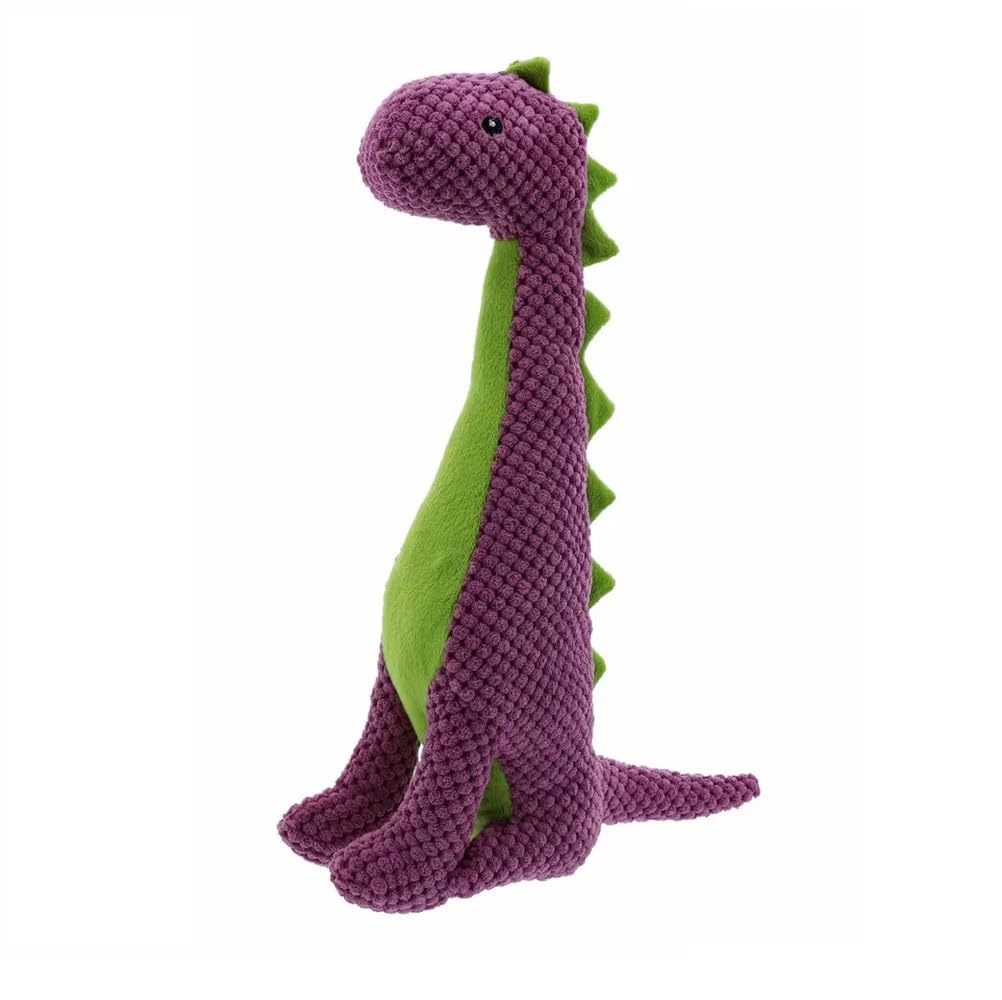 Product description: Jurassic Dinosaur Dog Toys Our Jurassic Cord Crew dinosaurs are great for playtime and naptime, plus it can minimize some of the anxiety that pups experience when their owners aren't around. This velvety soft squeaker toy is perfect for snuggling and games of fetch Made with a downy plush and special "popcorn" corduroy Contains a surprise squeaker to delight pups Choose Dinosaur and colors Brachiosaur - Orange, Purple - 11" Triceratops - Blue, Grey - 9.5" Massospondylus - Green, Purple - 15.5" T-rex - Blue, Green - 12.5"