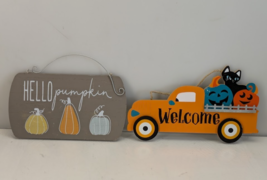 "Hello Pumpkin"&"Welcome" Autumn Wooden Hanging Wall Sign Pumpkin Decor Lot of 2
