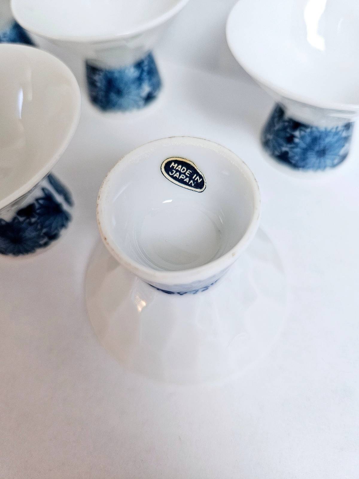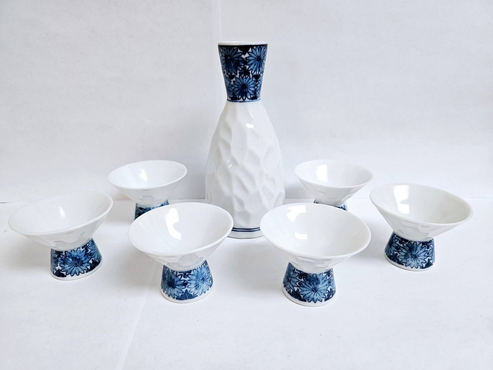 Vintage ASC East 7PC Japanese Saki Set Asian Blue and White Bottle & Thimble Cup