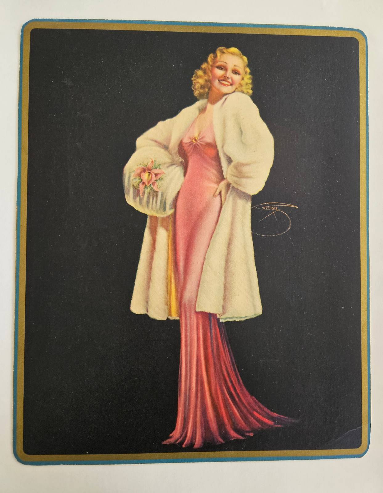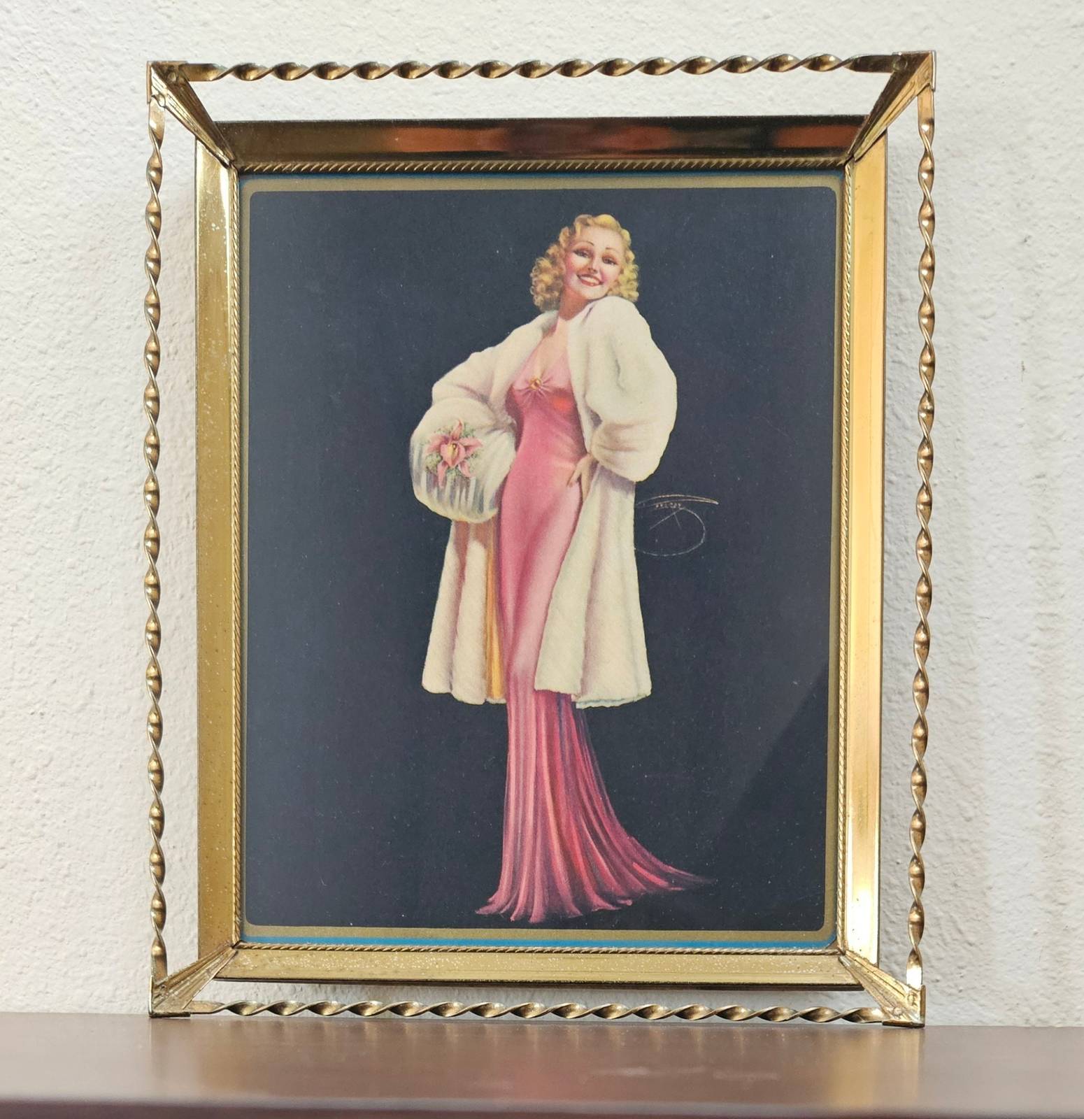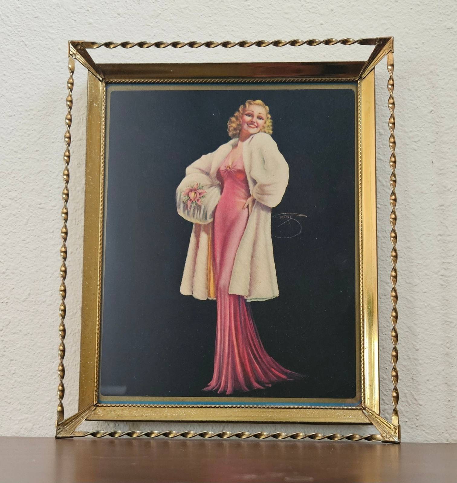 Original 1930's lithograph featuring a pin up wearing an Ermine fur with an Orchid muff , possibly titled "Ermine and Orchids". Original artwork was done by Billy De Vorss, a popular illustrator of pin-up girls throughout the 1930's-60's. The print is made of heavy paper, more like like a thin cardboard and has rounded corners. Possibly cut out from something else. It is in an old Art Deco frame from the same time period. The cardboard backing on the frame shows some previous water damage that happened before the print was put inside. The print does not have water damage and is in very good vintage condition. It is showing light wear/age in places and around the edges but no major damage. See all photos as they are part of the description. Looking at the back, you can see this frame is designed for wall mounting rather than tabletop.