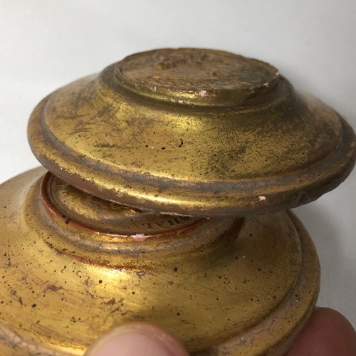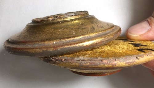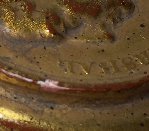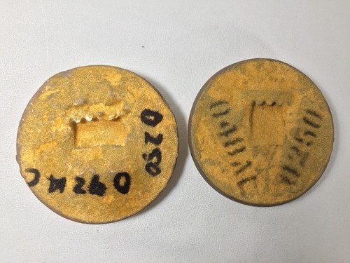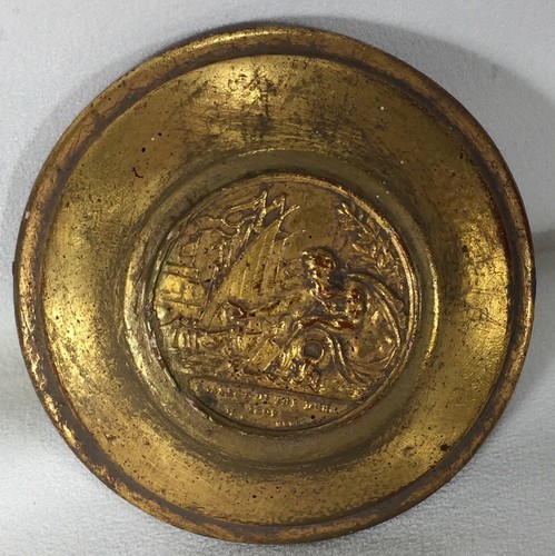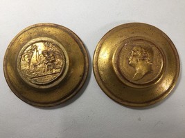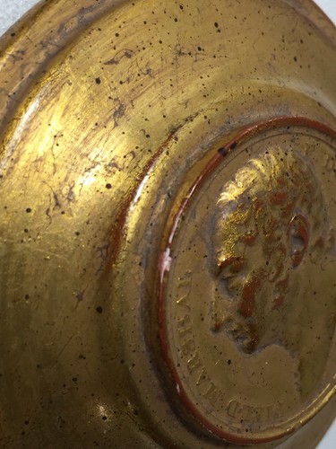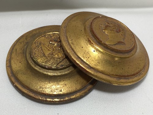 Offered here is a pair of small wall plaques. They look as if they are made of plaster of some sort, based on sound and backing with hanger. Unsure what the coin looking part is actually made of, Sounds slightly denser, But is actually thinker there as well. Not sure if it is a replica or plaster, However based on the photos it looks like it is chalk.Definition of the coin area is decent, but not clearly defined. Look like they were painted over with gold paint with a darker wash on top rubbed off. I am unsure of exact age or maker of these plaques, but look prestigious. If you have any idea what era or really what they are, please let me know. Thanks in advance, appreciate your time.