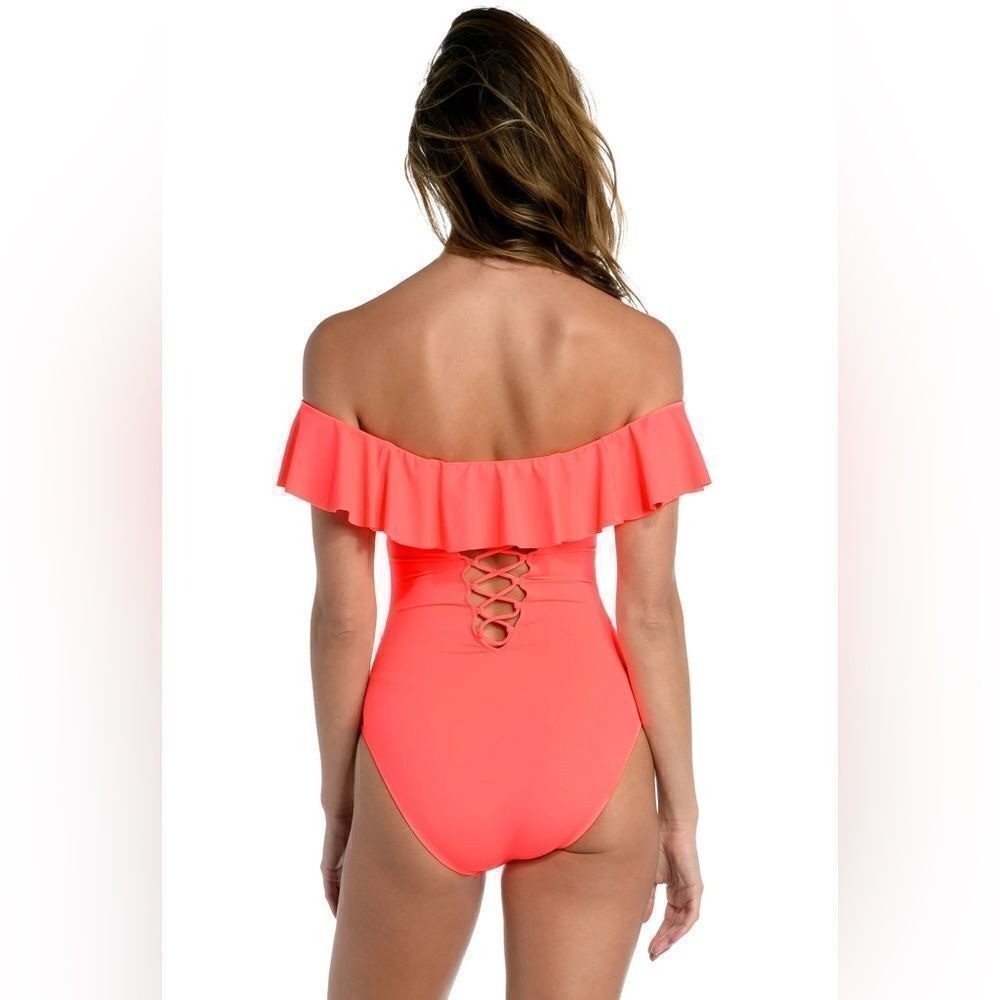 La Blanca Island Goddess Off Shoulder Ruffle One Piece Swimsuit Size 8 Coral NWT