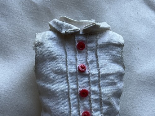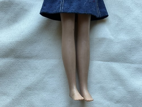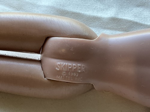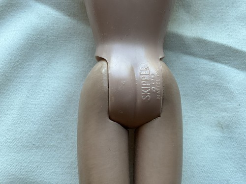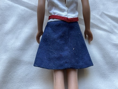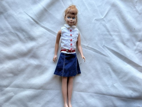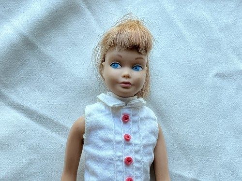 This is a vintage 1963 Skipper doll in an original outfit. Her hair has been cut and is in good used vintage condition. Great for a collection or as parts.