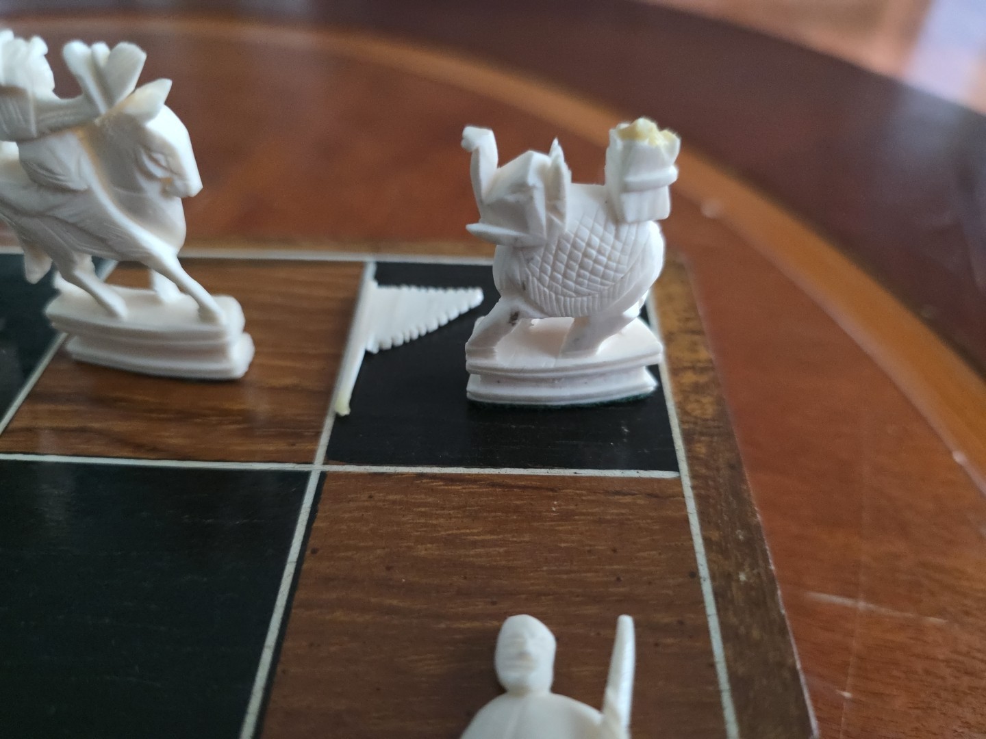 Beautiful antique chess set in a foldable storage board. It has been well taken care of but one of the flags has broken off of the knight I believe. I believe the case had a foam piece that held the pieces in tight. It also does not have a latch to hold the case closed so it will have to be held by hand when moving or the latch must be replaced. Everything is as pictured and described and the set looks amazing.
