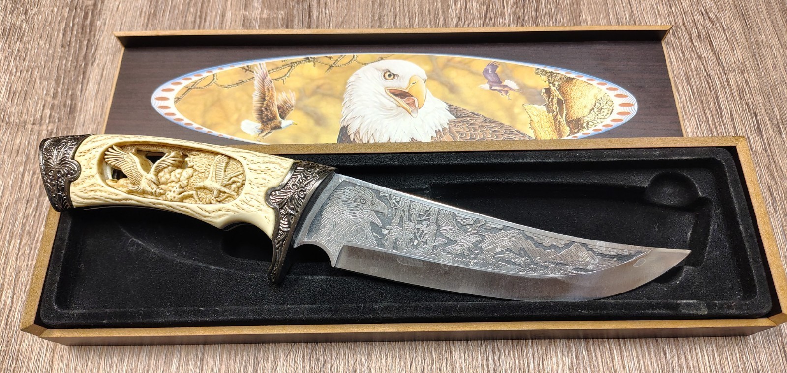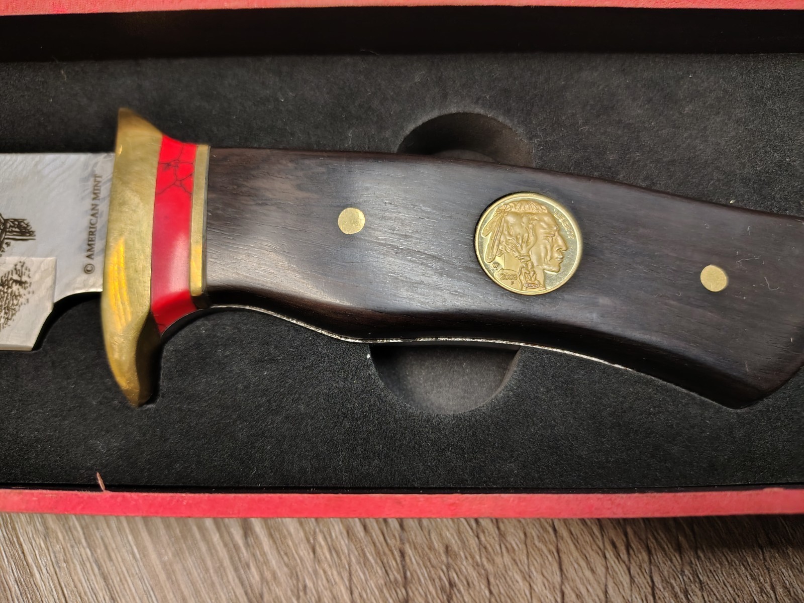 lot of 2 knives, bowie knife lot, boxed knives, presentation box knives, collectible fixed blade, display knife set, bowie knife set, stainless steel bowie, etched blade, engraved blade, wildlife knife, eagle knife, buffalo bison knife, western americana, lodge cabin decor, man cave decor, gift for collectors, gift for hunters, new open box, unused knives, MTech USA PK-8212E, PK8212E, MTech Eagle knife, carved faux ivory handle (not real ivory), resin handle, ornate guard pommel, American Mint knife, American Gold Buffalo, 420 stainless, brass guard, coin medallion handle, buffalo coin medallion, presentation display, collector knives lot, fixed blade lot, display case knives