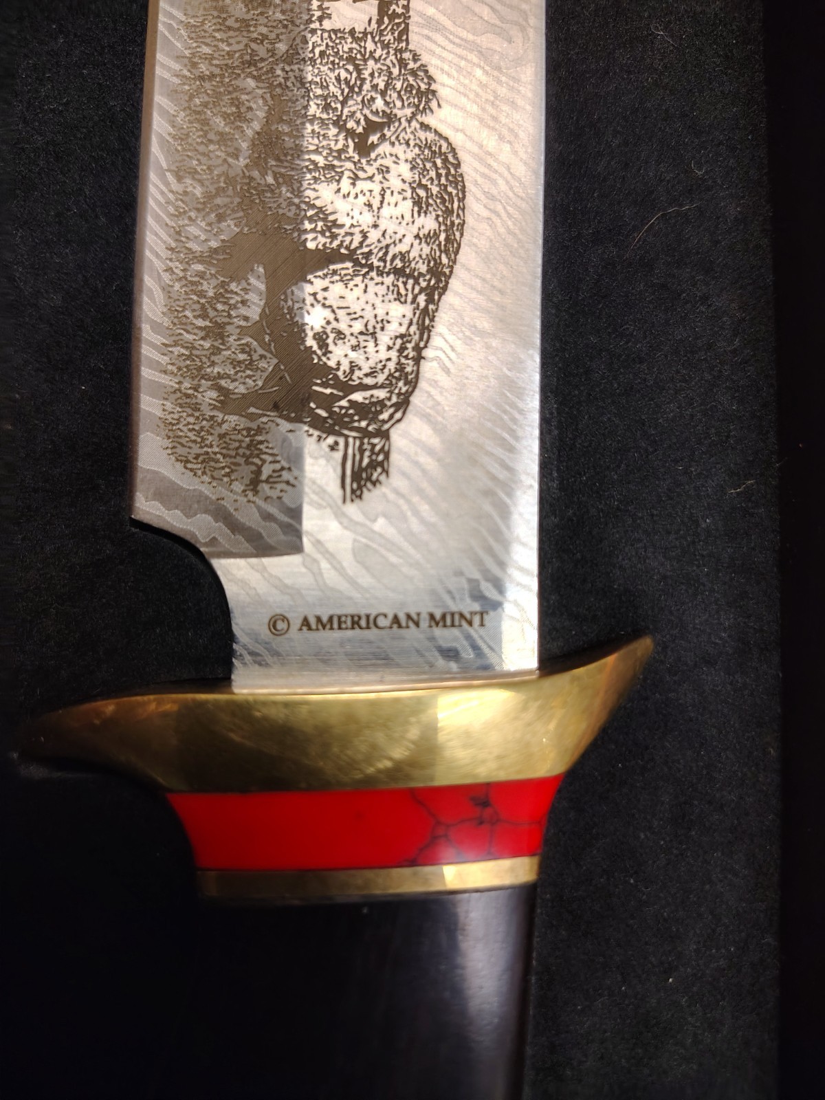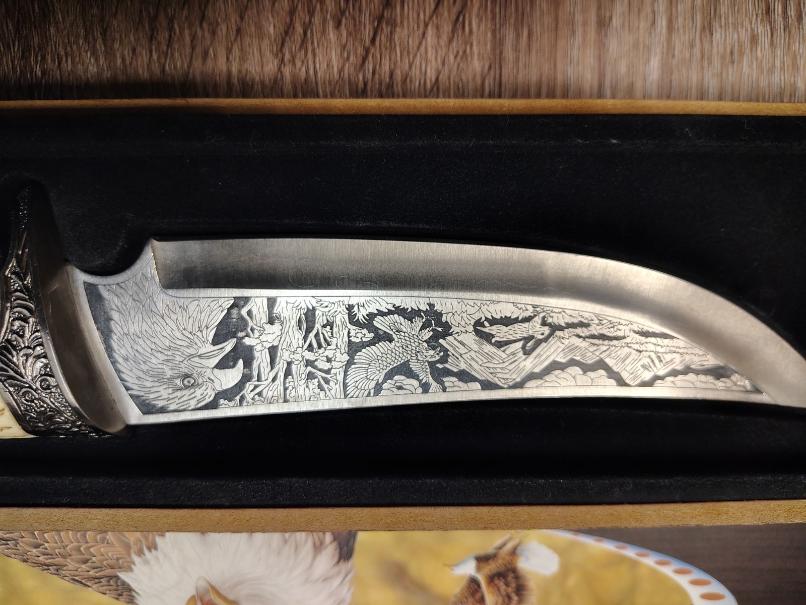 ? Etched wildlife scene blade; ornate metal guard/pommel.