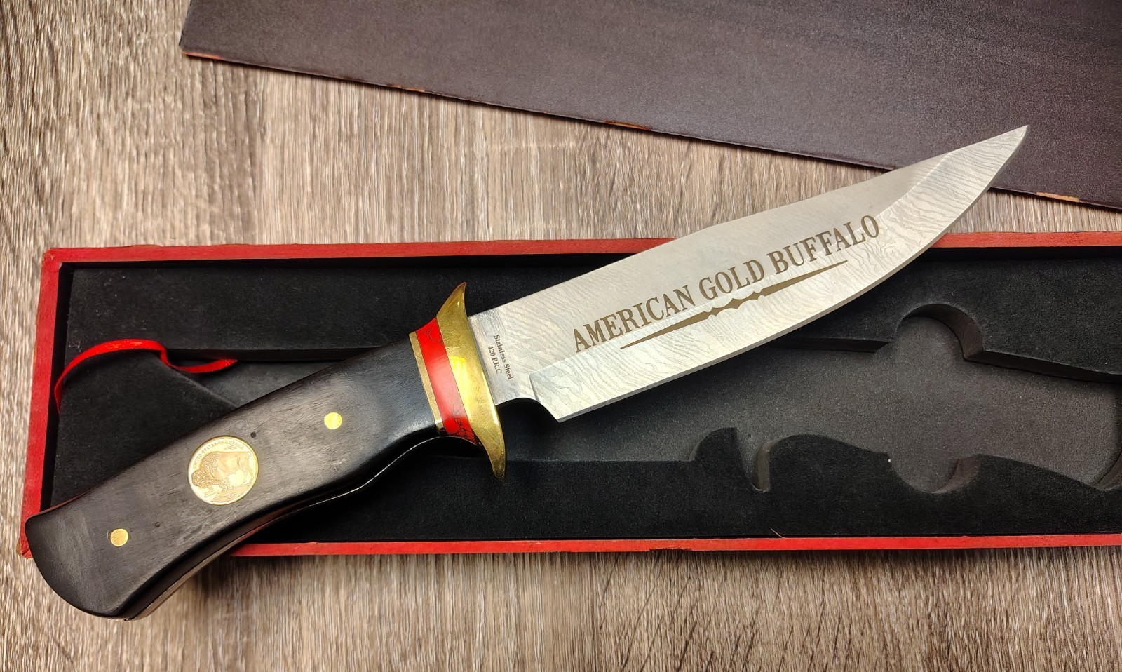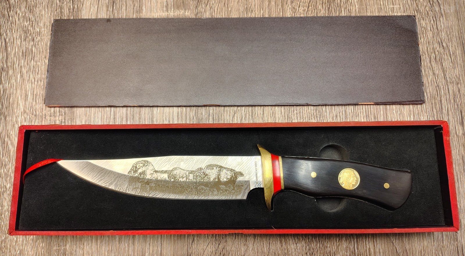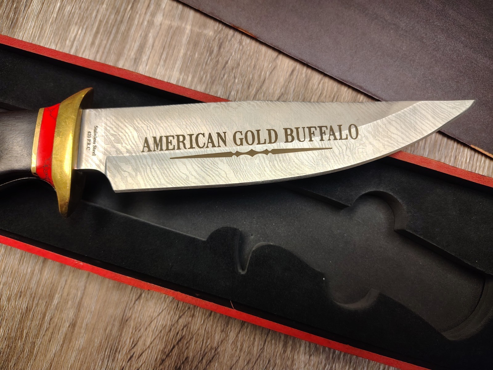 ? 420 stainless blade etched with Native American buffalo on one side and ?AMERICAN GOLD BUFFALO? on the reverse.