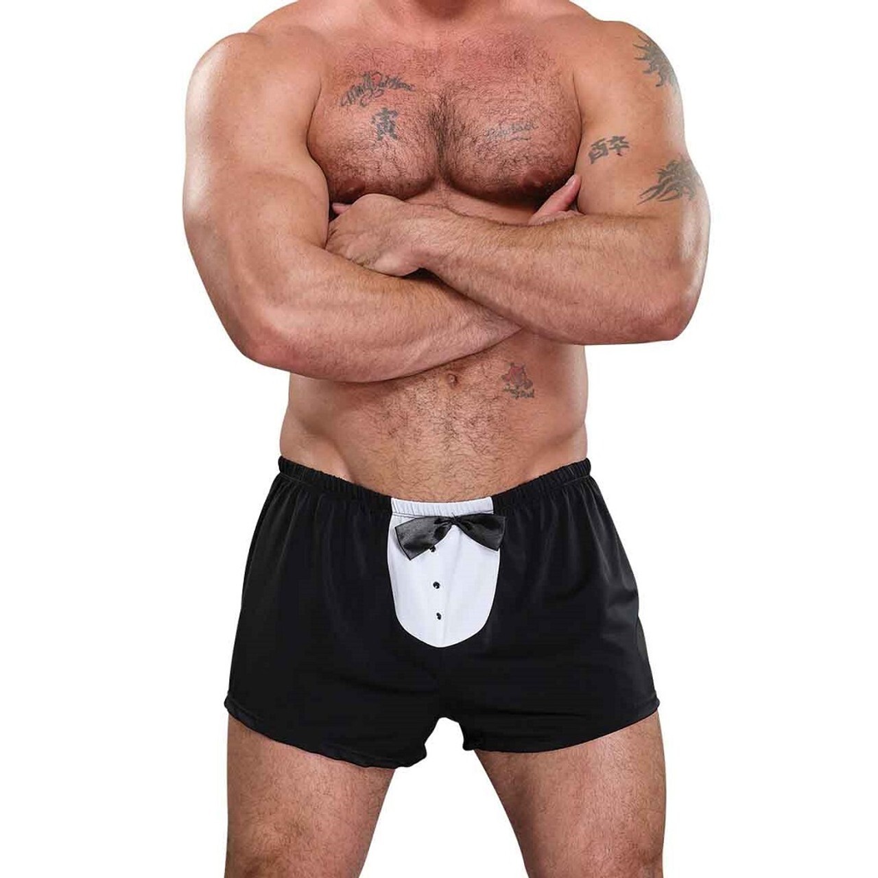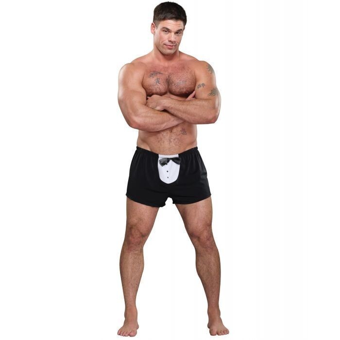 For the guy who has no reservations! The Male Power boxer is made of 100% Nylon. The one-size fits most outfit has a tuxedo design on the crotch.