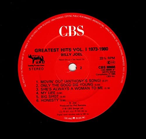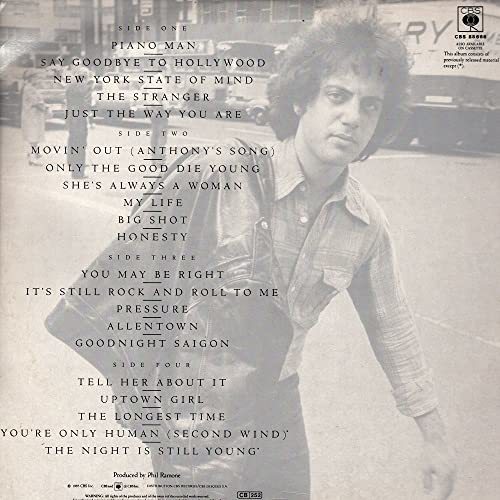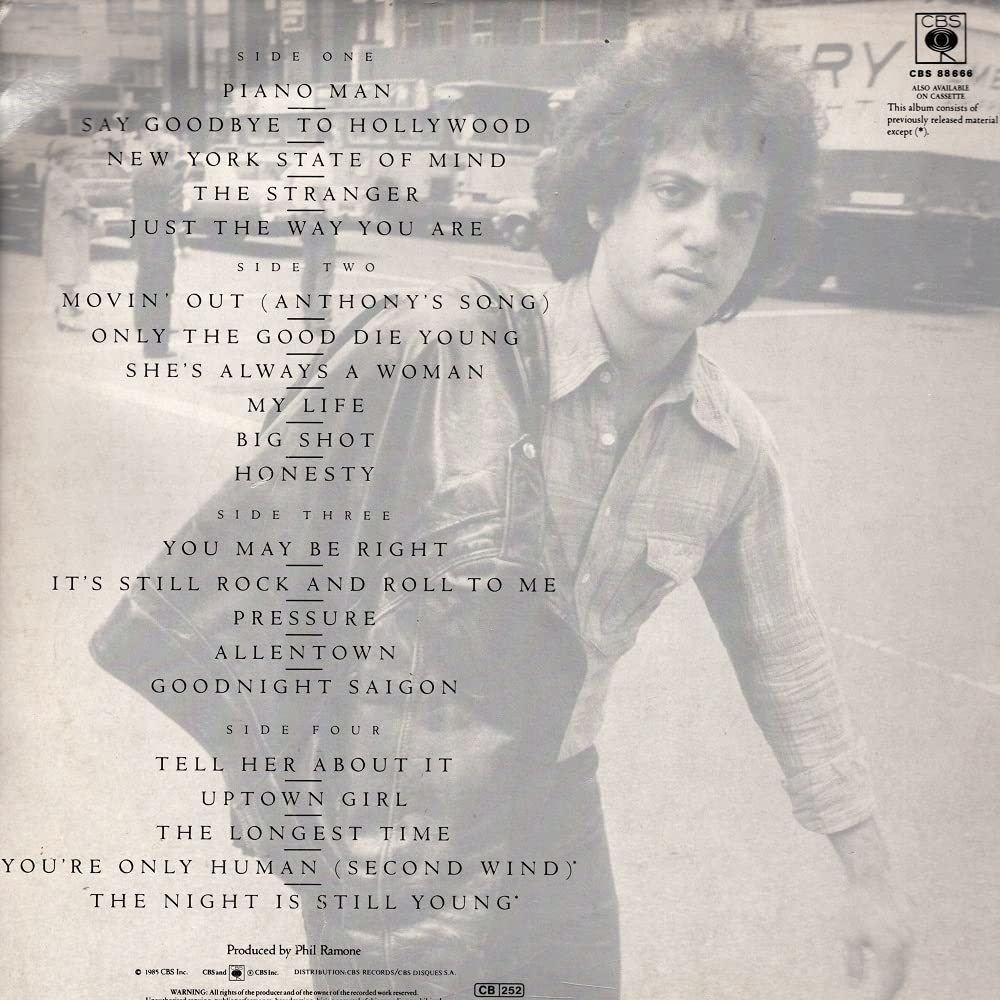 A1Piano Man5:36A2Say Goodbye To Hollywood3:53A3New York State Of Mind5:58A4The Stranger4:55A5Just The Way You Are3:34B1Movin' Out (Anthony's Song)3:27B2Only The Good Die Young3:53B3She's Always A Woman3:18B4My Life3:50B5Big Shot3:43B6Honesty3:50C1You May Be Right4:09C2It's Still Rock And Roll To Me2:54C3Pressure3:13C4Allentown3:49C5Goodnight Saigon7:02D1Tell Her About It3:55D2Uptown Girl3:15D3The Longest Time3:35D4You're Only Human (Second Wind)4:47D5The Night Is Still Young5:27