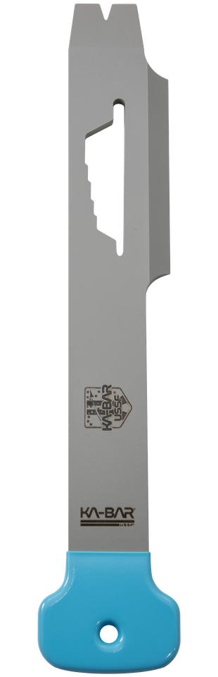 The 2484SF Bridge Breacher is one solid piece of 1095 Cro-Van steel coated in a gray powder coating. The Bridge Breacher has a pry bar tip, a slotted wrench opening, and a chiseled blade. It measures 13" overall with a cutting edge of 2". The butt end of the Bridge Breacher is coated in blue Plastisol to help with grip and you have an optional lanyard hole to use if necessary. From roaming the stars to defending your own space, the KA-BAR Knives USSF products have universal appeal and will put you light-years ahead of anything you may encounter.