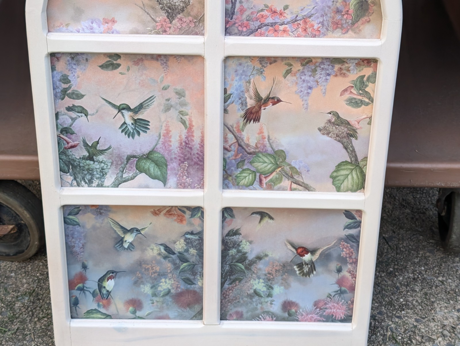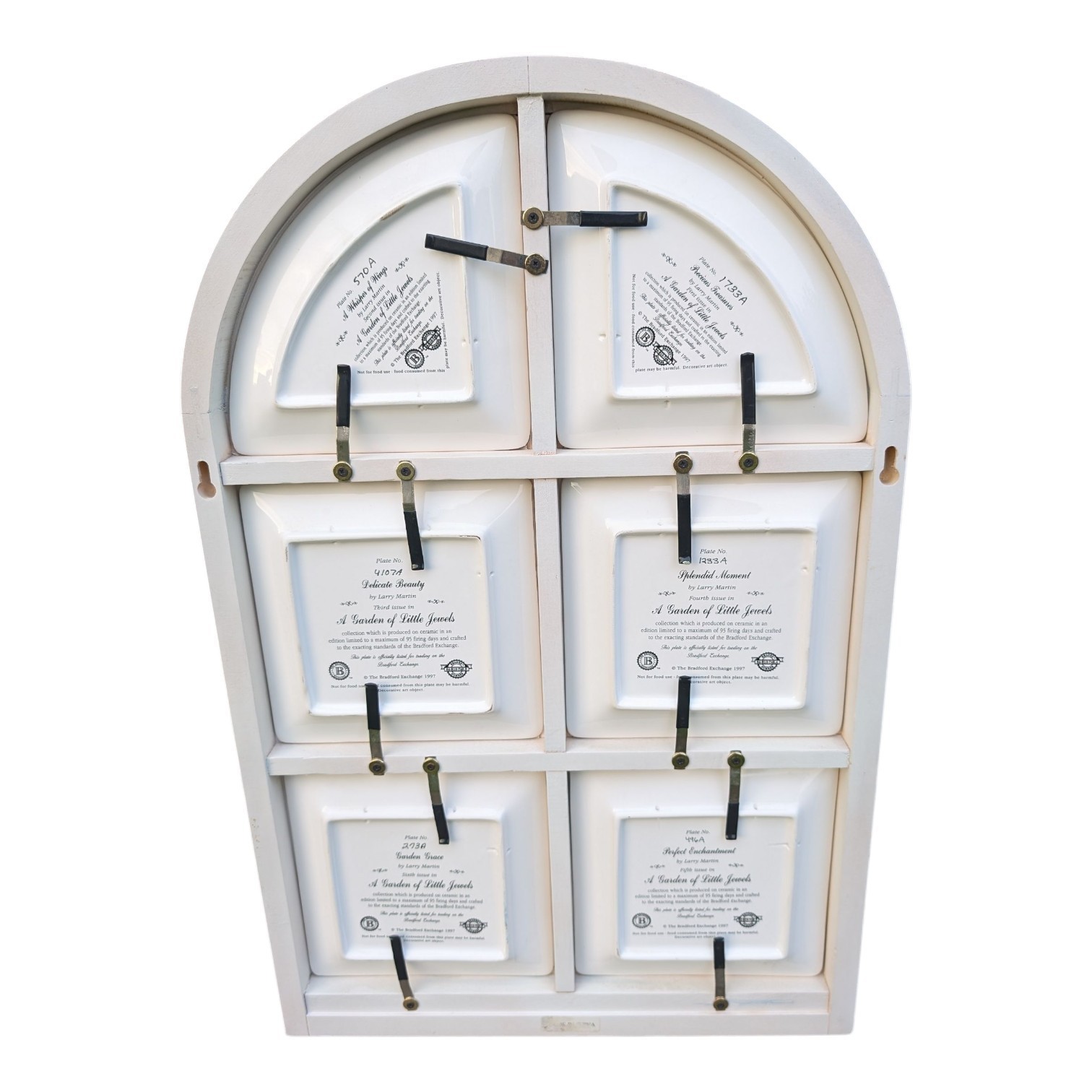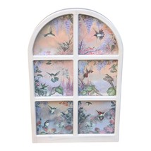 The "A GARDEN of LITTLE JEWELS" Set of 6 Hummingbird Plates in a Window by Larry Martin is a collector plate set featuring a unique design of square and pie-shaped plates showcasing beautiful hummingbirds. Made of ceramic and featuring a multicolor palette, these decorative plates are a vintage piece from 1997, perfect for adding a touch of charm to any home decor. Displayed in an arch window, these collector plates are sure to be a delightful addition to any collection or as a standalone decorative display.