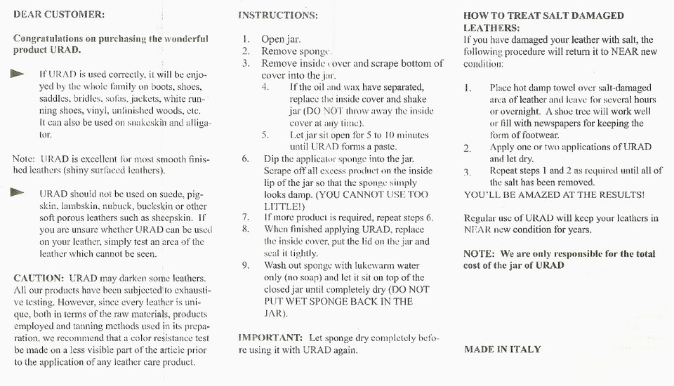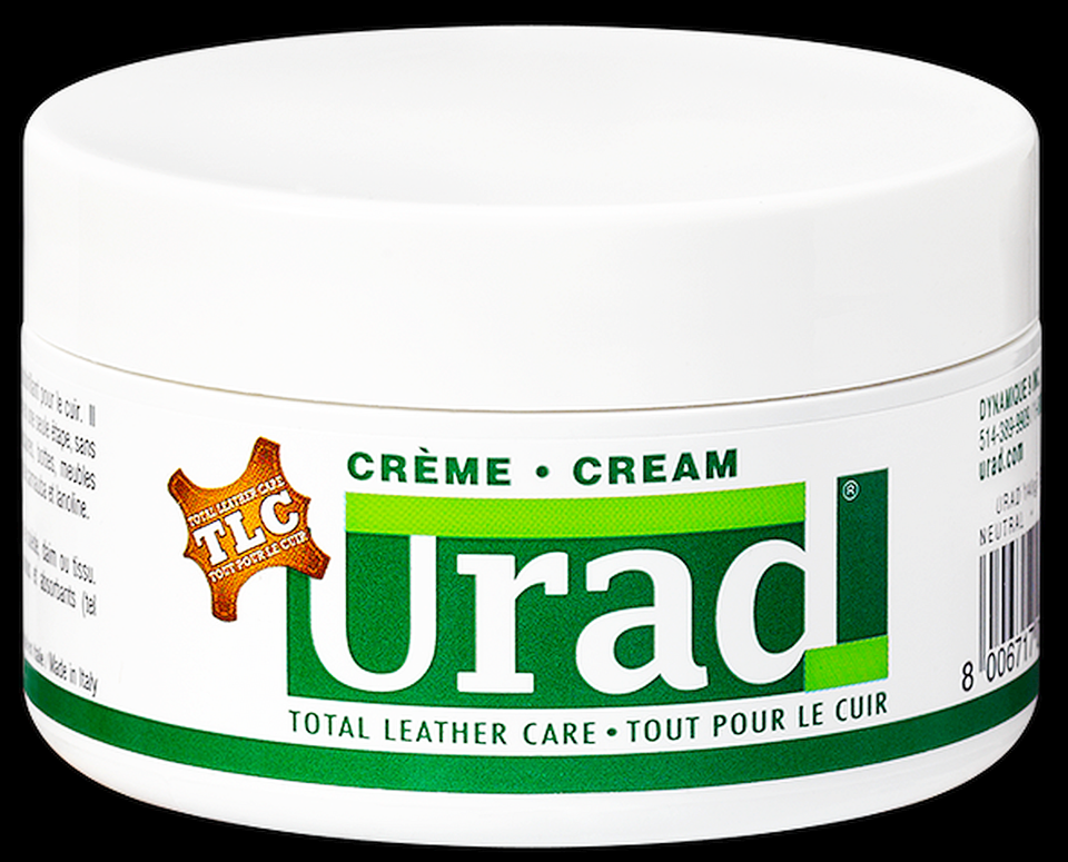 FOR SALE IS ONE (1) NEW PLASTIC JAR OF Urad BRAND CREAM TOTAL LEATHER CARE NEUTRAL COLOR 3.5 ounce (100 g) WITH APPLICATOR SPONGE MANUFACTURED BY DYNAMIQUE 9 INCORPORATED MPN UR100100 UPC# 8006717001011. GENUINE URAD CREAM (creme), MADE IN ITALY, IS A SELF SHINING, ALL IN ONE LEATHER CREAM. URAD CREAM IS THE ESSENTIAL ONE STEP PRODUCT FOR COMPLETE LEATHER CARE. THIS NEUTRAL COLOR IS MANUFACTURER RECOMMENDED FOR EVERYTHING, BUT BOOTS AND SHOES. THIS URAD NEUTRAL CREAM CLEANS, MOISTURIZES, CONDITIONS, PROTECTS AND SHINES IN ONE QUICK AND EASY STEP. FOR LEATHER, SHOES, BOOTS, SADDLES, TACK, FURNITURE AND MORE. URAD CONTAINS CARNUBA WAX AND LANOLIN, CONTAINS NO SILICONE, ALCOHOL OR PETROLATES. URAD TOTAL LEATHER CARE NEUTRAL COLOR CREAM IS GOOD FOR THE LEATHER. 100% NATURAL INGREDIENTS, BIODEGRADABLE AND NON TOXIC. URAD BRINGS LIFE BACK AND REVIVES THE ORIGINAL COLOR. URAD IS EXCELLENT AT RESTORING DAMAGED OR DRIED UP LEATHER. THIS SALE IS FOR NEUTRAL color GENUINE URAD CREAM IN A 3.5 ounce PLASTIC CONTAINER WITH APPLICATOR SPONGE. PROTECTS AGAINST WATER, SALT, CALCIUM AND MOLD. MADE IN ITALY AND CREATED BY THE DARU FAMILY (can you spell daru backwards?) IN MILANO, ITALY, IN 1969 FOR HIGH END ITALIAN LEATHER FURNITURE. YOU WILL RECEIVE ONE (1) 3.5 ounce PLASTIC CANISTER OF NEUTRAL COLOR GENUINE URAD CREAM TOTAL LEATHER CARE, WITH APPLICATOR SPONGE, SHIPPED BY USPS.....