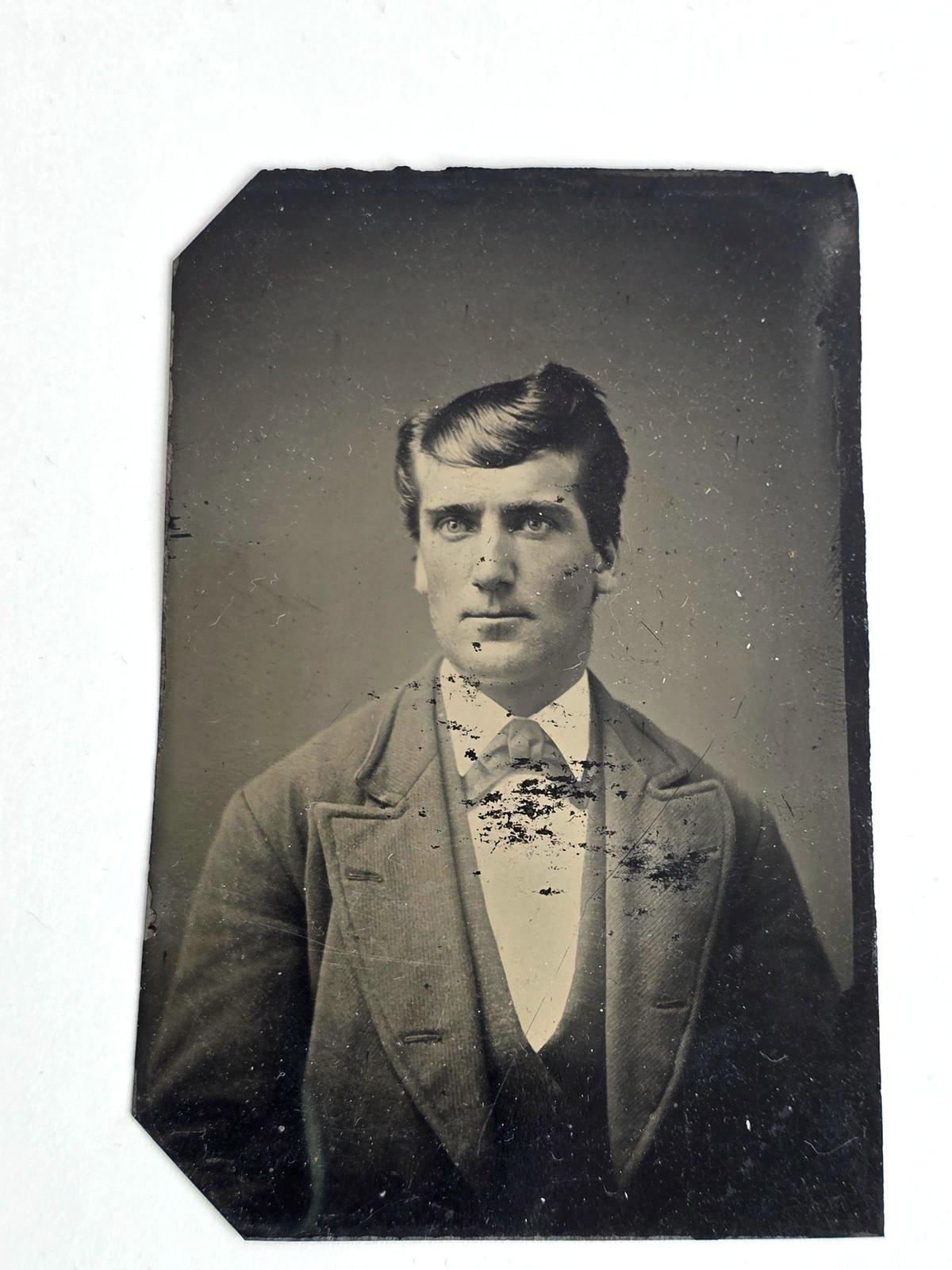 Tin Type Gent History of America - Good Condition, Visible Wear See Photo ... This is a tin type photograph, a direct positive on a thin sheet of metal, likely iron. The image shows a head-and-shoulders portrait of a young man. The subject is well-dressed, wearing a dark coat with wide lapels over a waistcoat and a white shirt with a cravat or tie. His hair is neatly parted on the side and appears to be combed back.