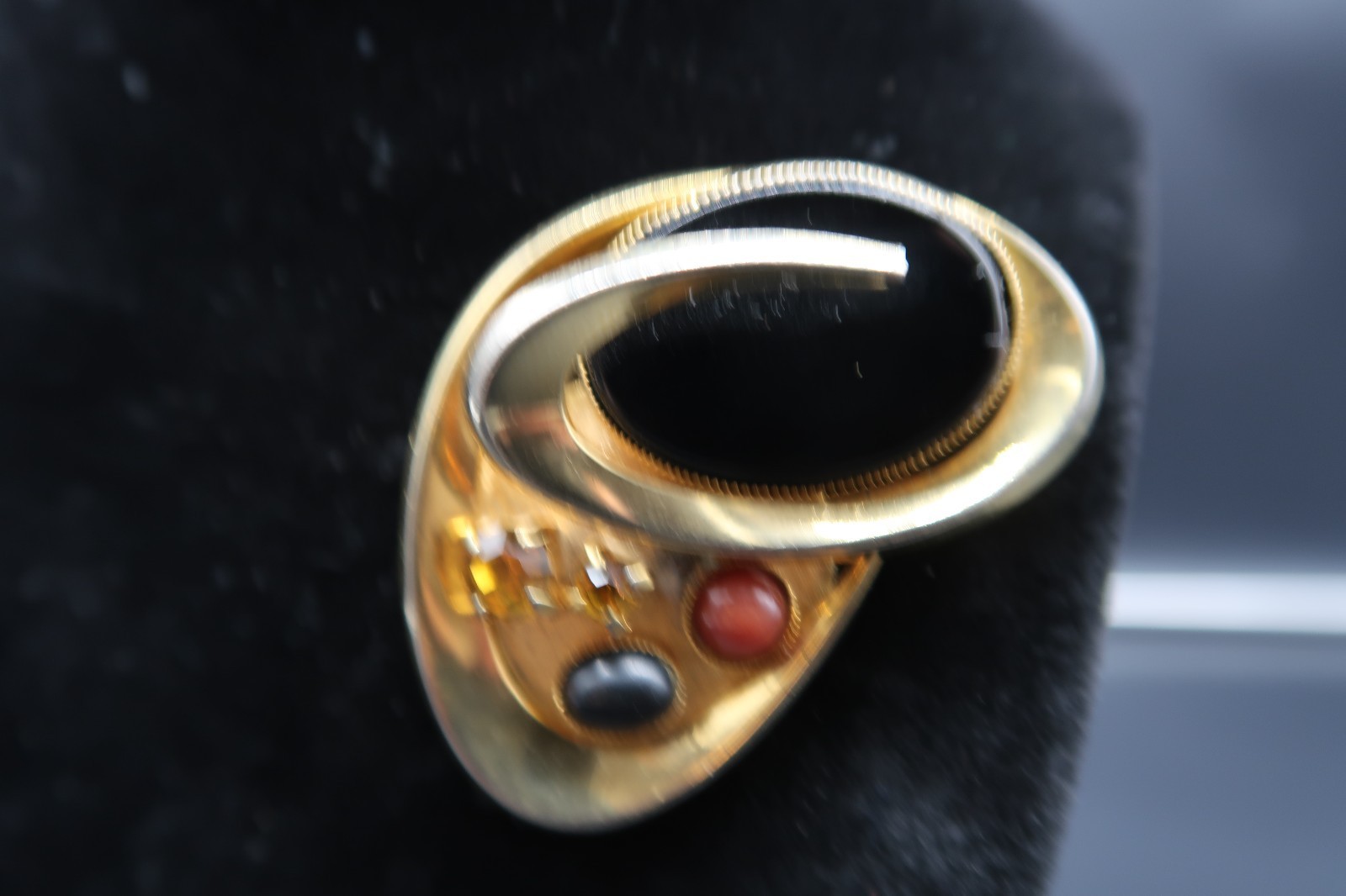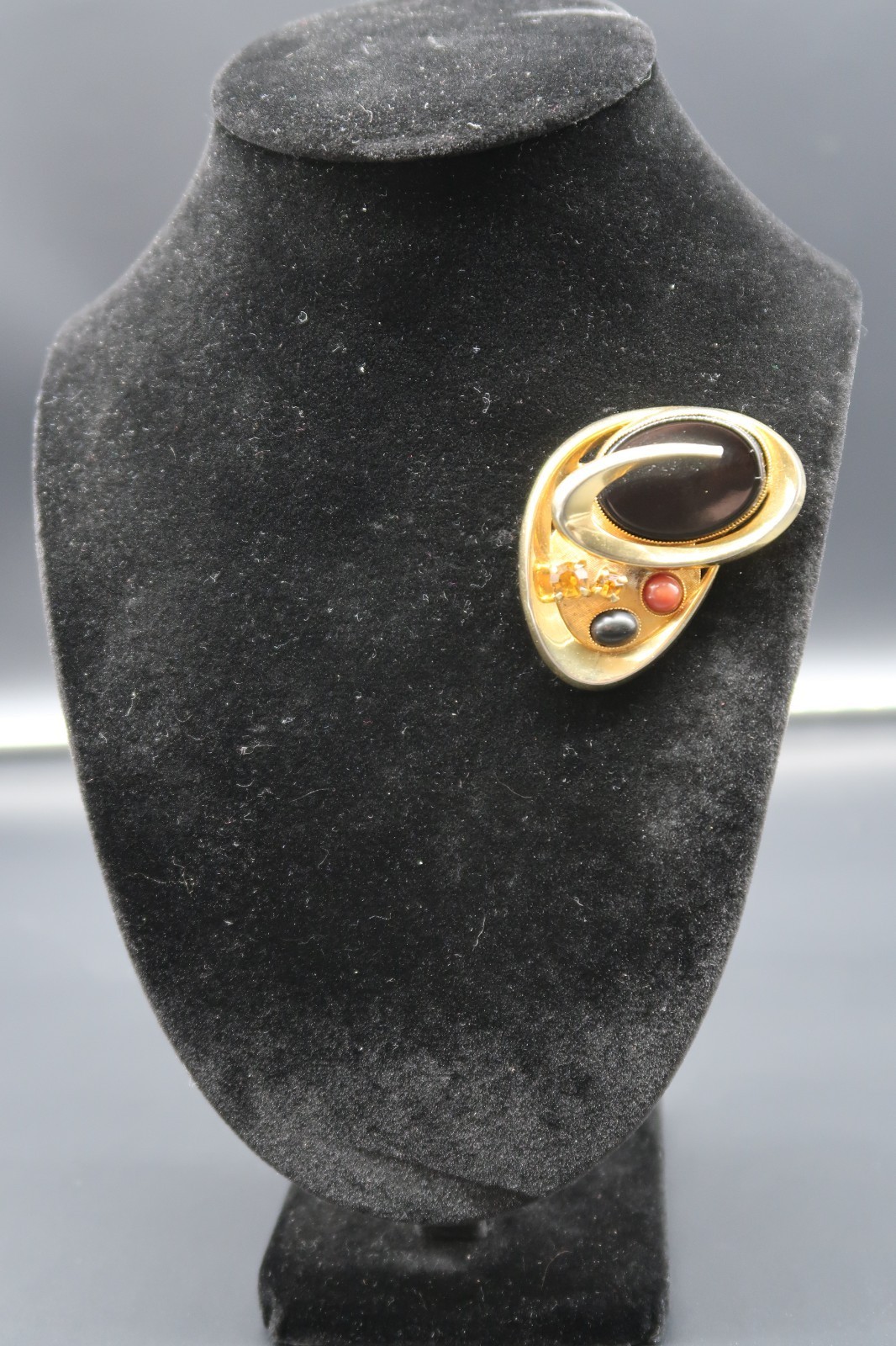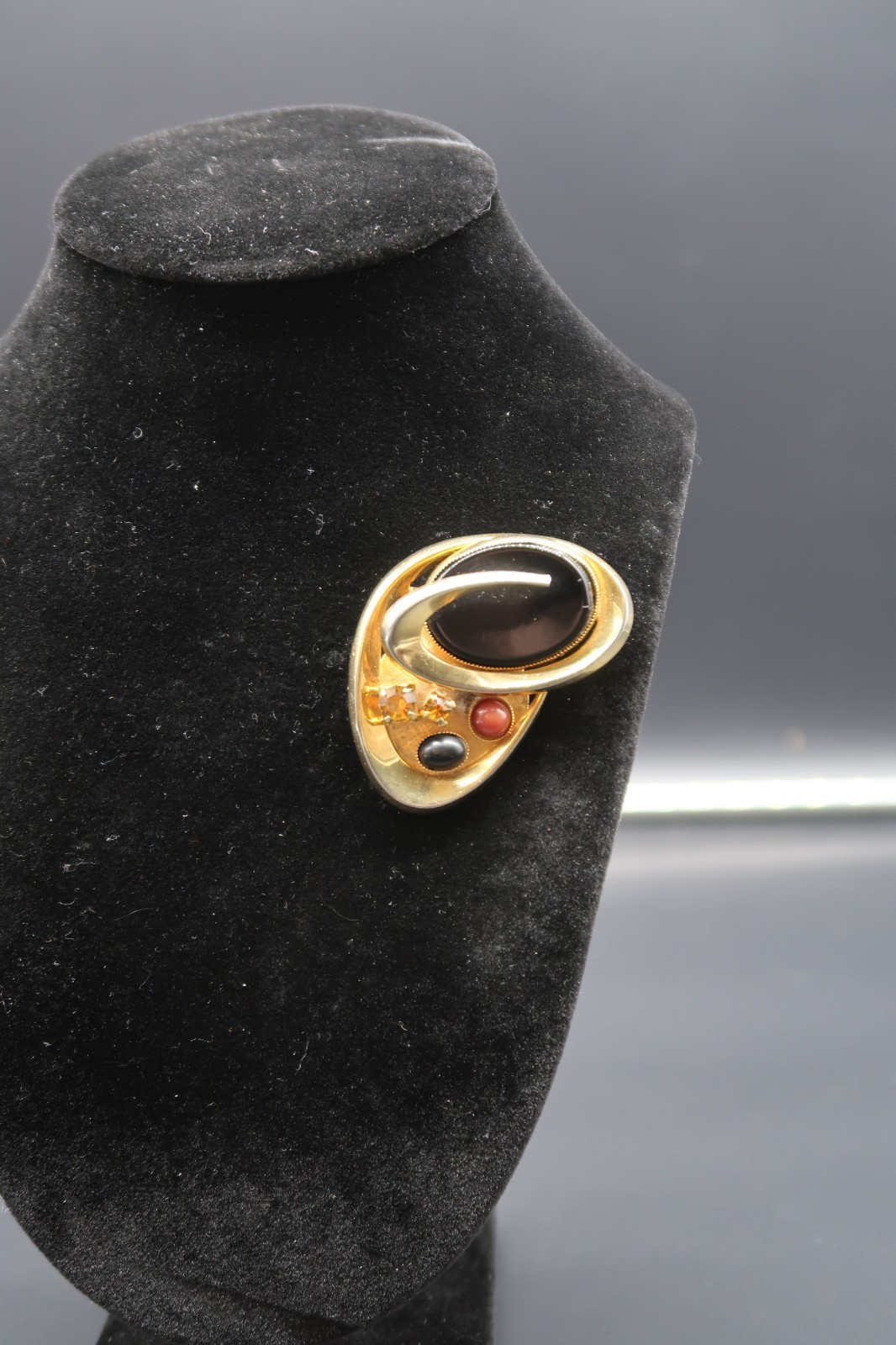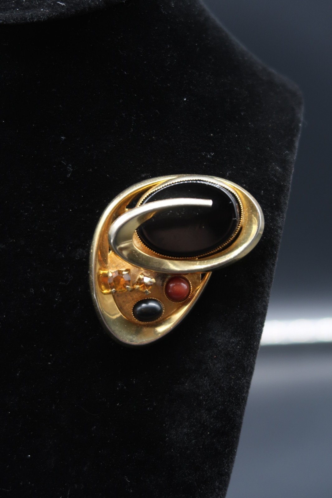 Vtg MCM Abstract Multi Tone Textured Brooch Black & Brown Cabachons & Rhinestone