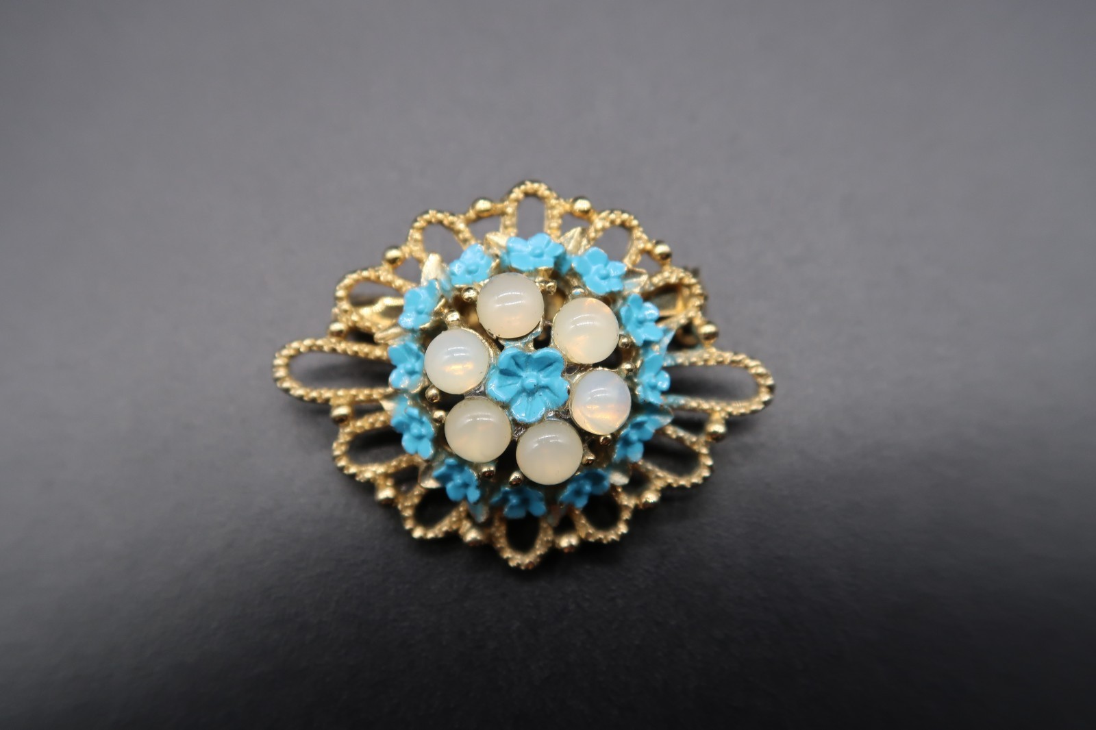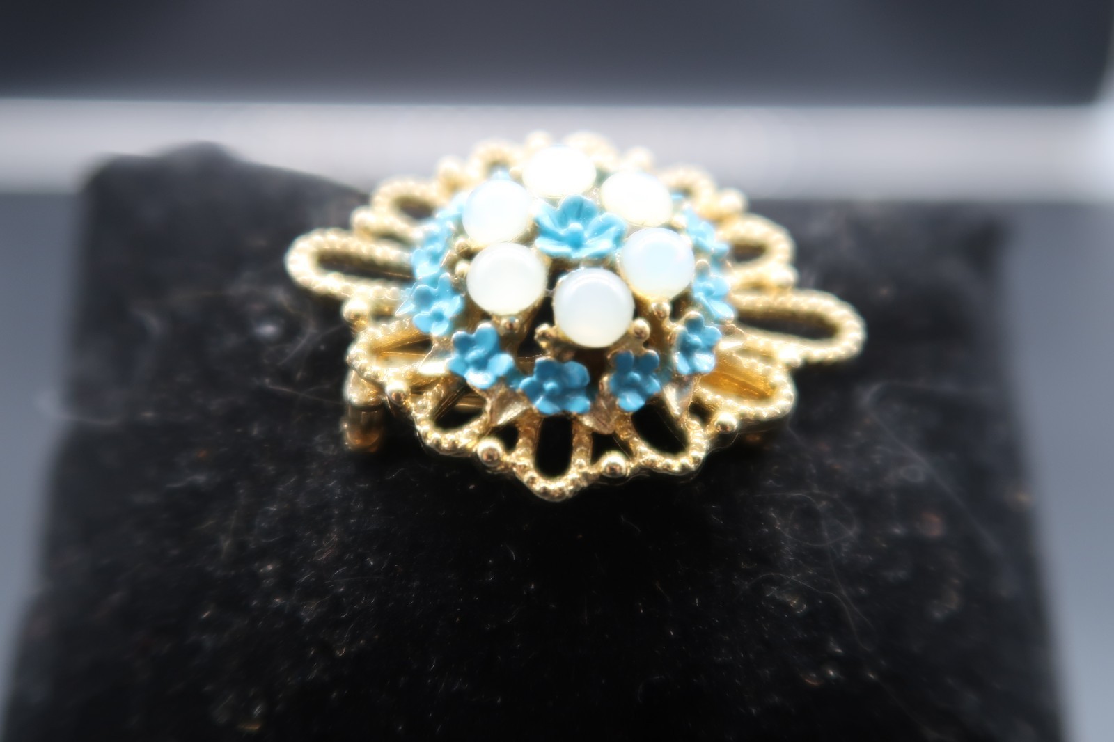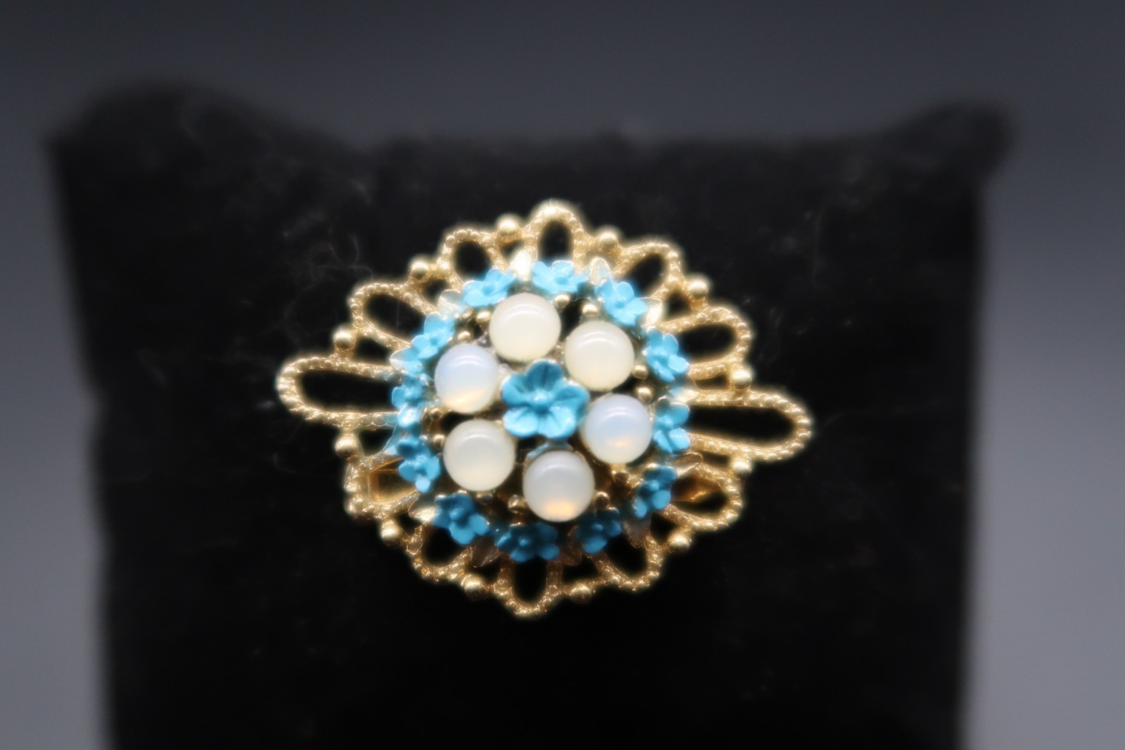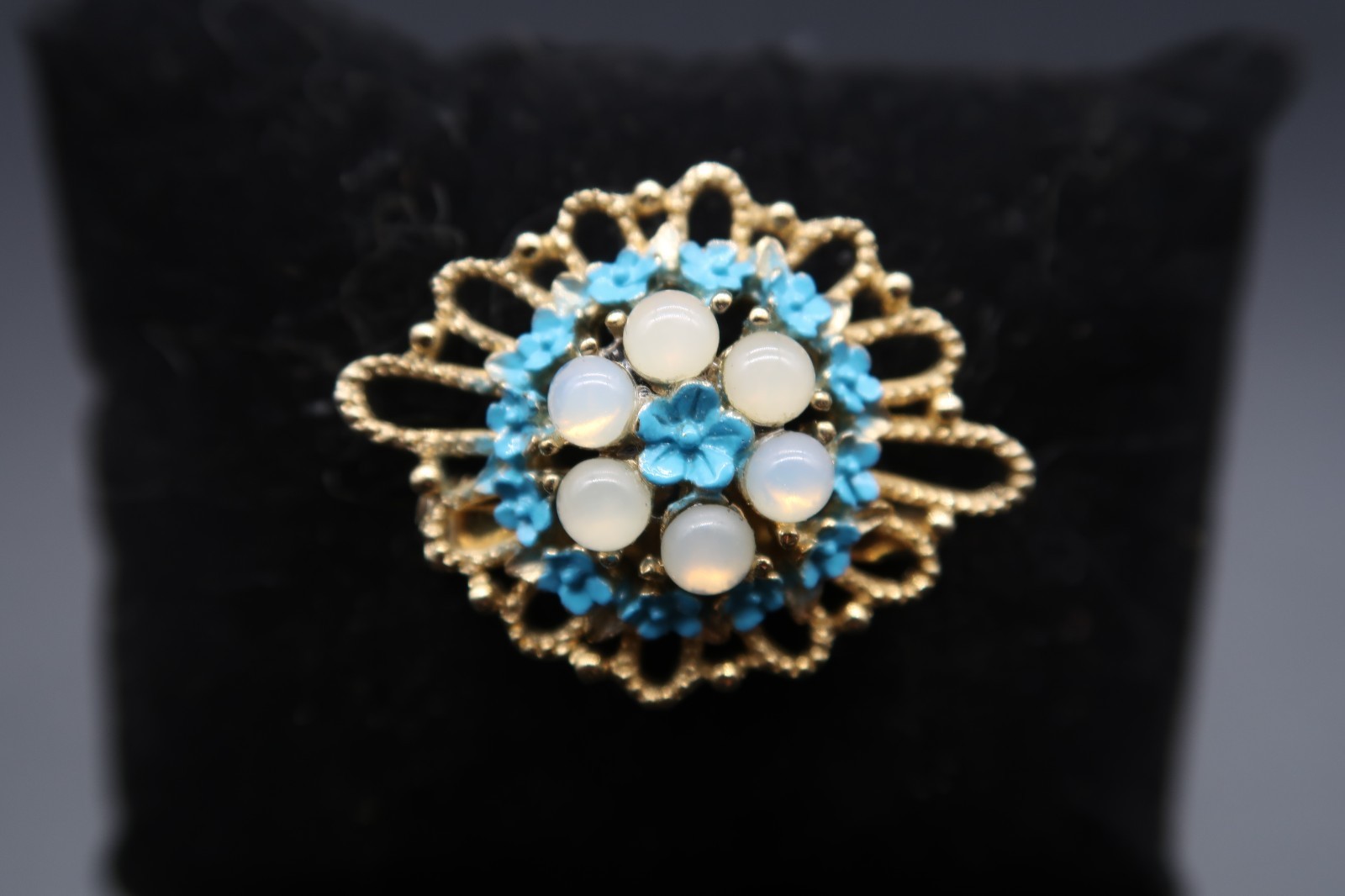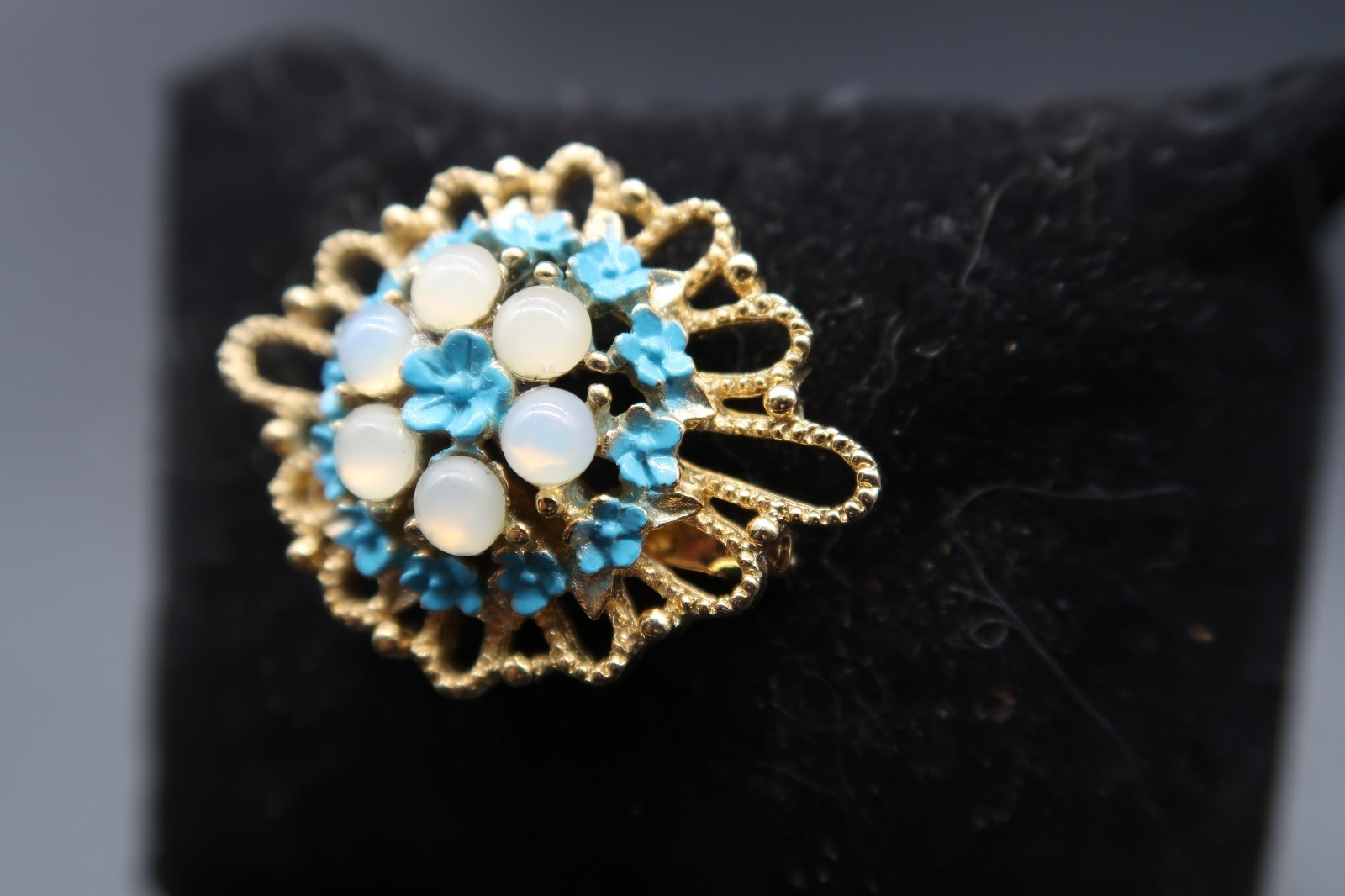 Vtg Gold Tone Blue Enamel Over Metal Flower Brooch W/ Milky Cabachon Accents