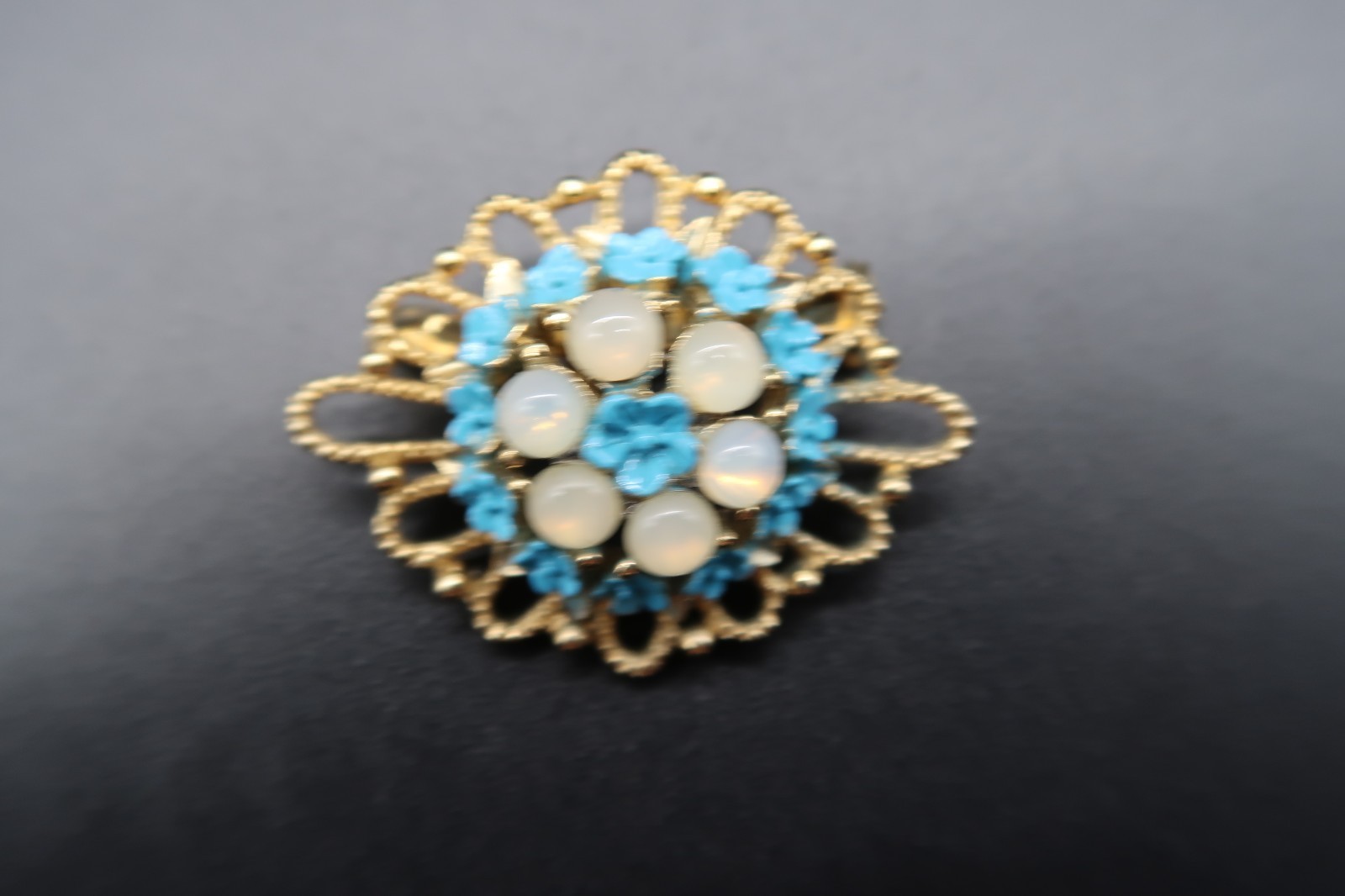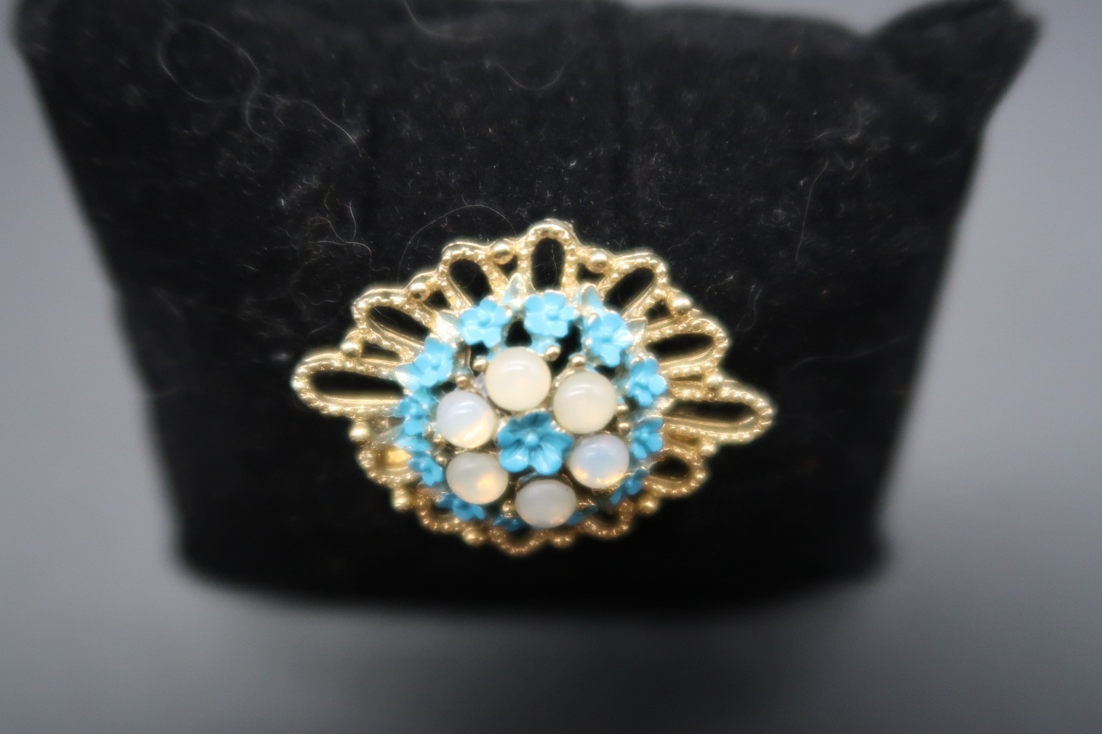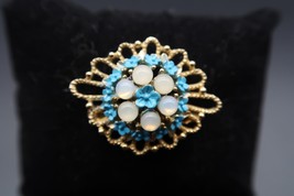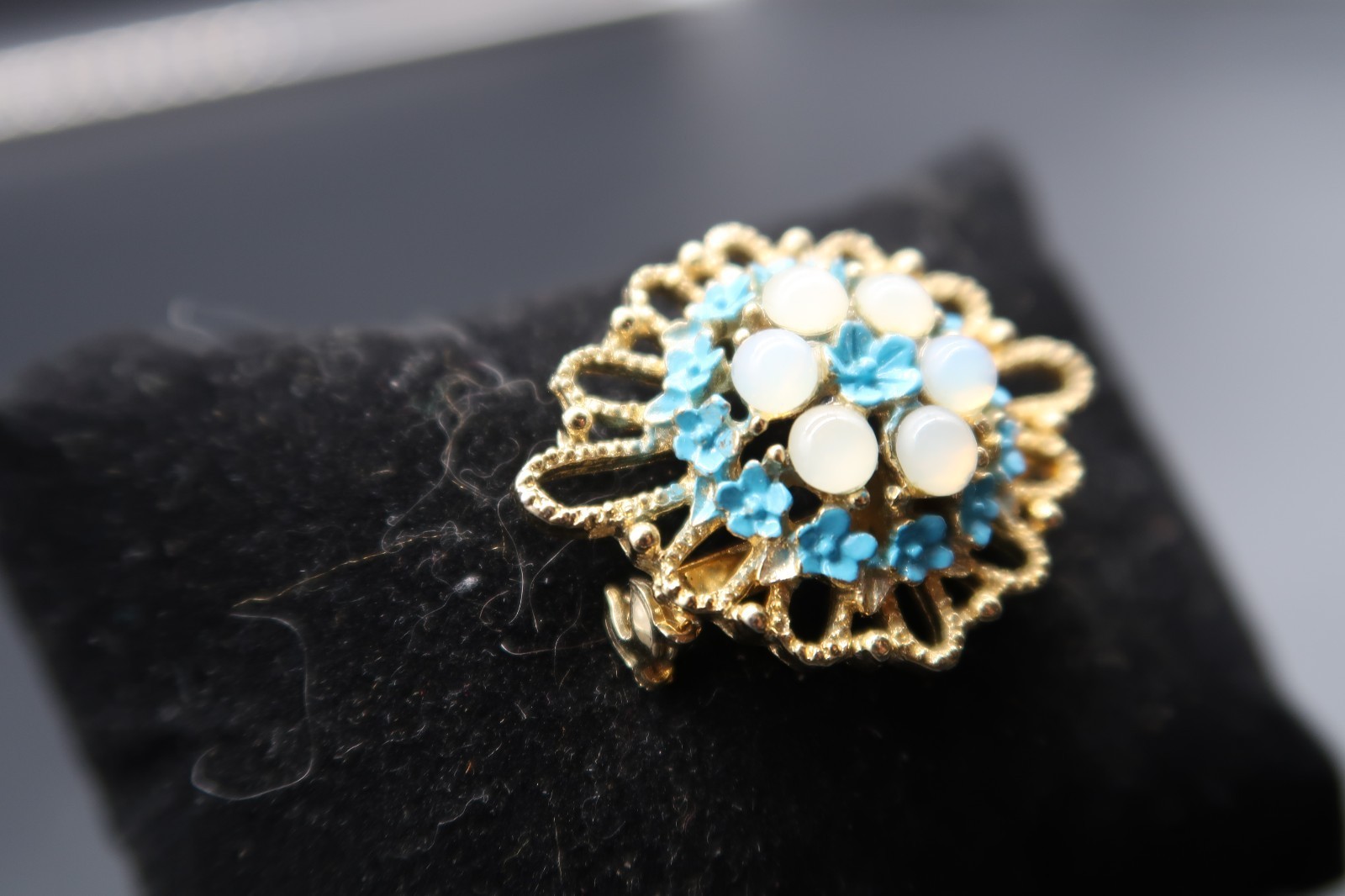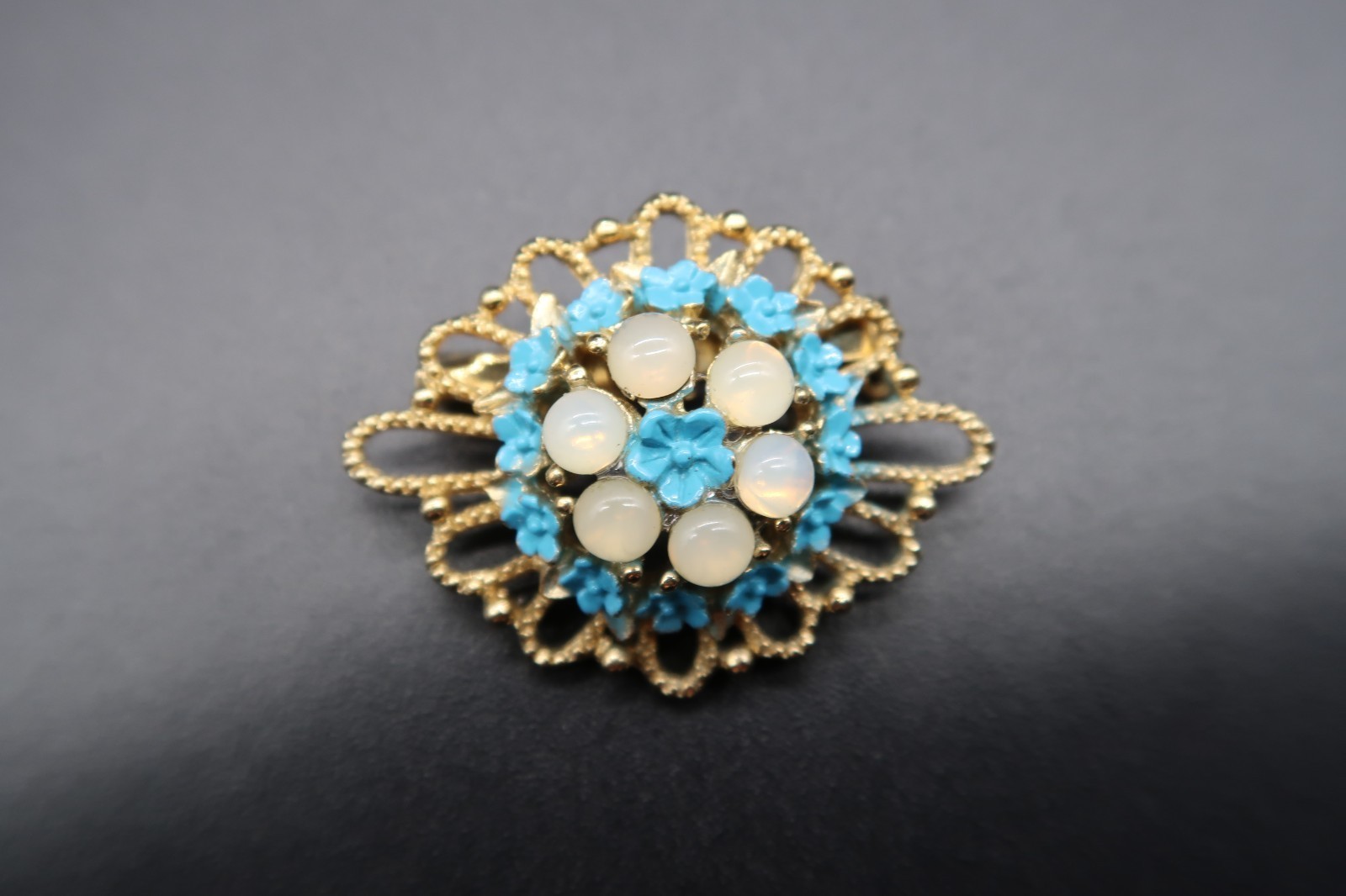 Vtg Gold Tone Blue Enamel Over Metal Flower Brooch W/ Milky Cabachon Accents