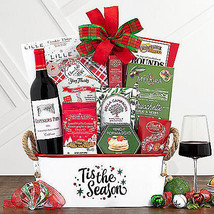This holiday wine basket arrives with California's Vintners Path cabernet sauvignon with black cherry and blackberry flavors leading to a long, smooth finish. A varied assortment of Lille chocolate cookie thins, sesame crackers, smoked Gouda cheese spread, Lindt milk chocolate truffles, mixed green and black olives, taralli Italian pretzels, dark chocolate truffles and more complete this holiday gift basket.