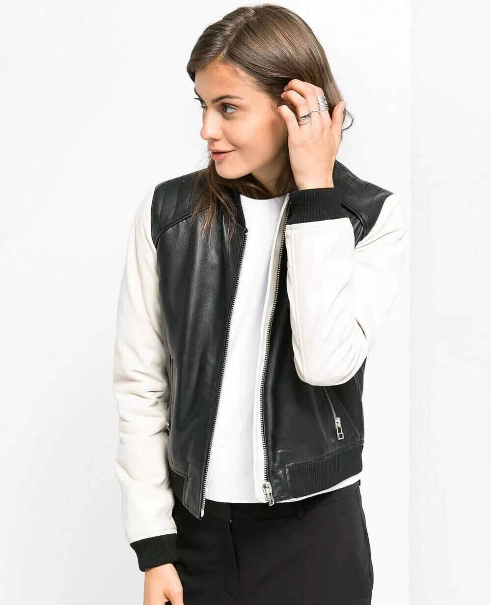 Chaqueta de cuero blanca y negra hecha a mano real de motociclista para mujer 100 % piel de cordero motocicleta/nosotros