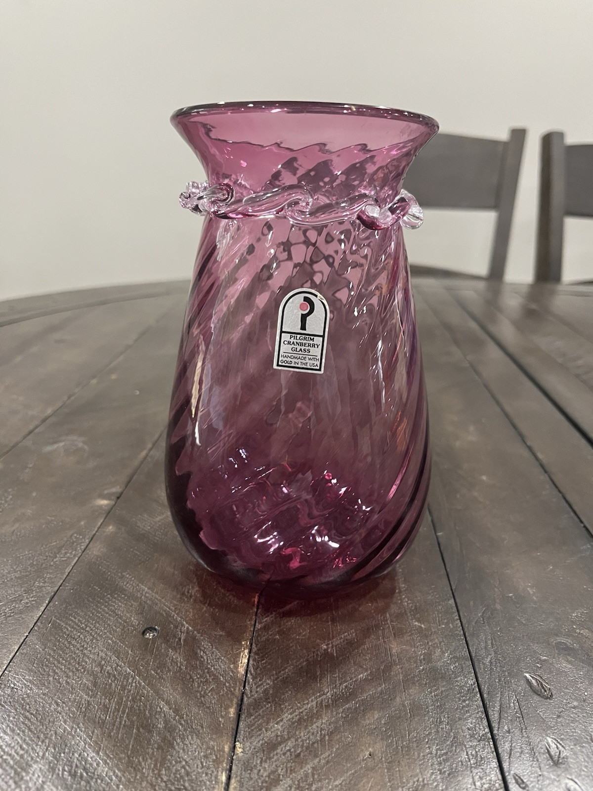 This vintage Pilgrim Glass small vase features an optic swirl design in a beautiful cranberry color with a ruffled top. The vase measures 7 inches tall and is an original piece, perfect for collectors of vintage and antique decorative items. The brand Pilgrim Glass is known for producing beautiful glass and pottery items, and this vase is no exception. It would make a great addition to any home decor, and the California Prop 65 warning does not apply. The vase is in excellent condition, ready to be displayed in your home or given as a gift.