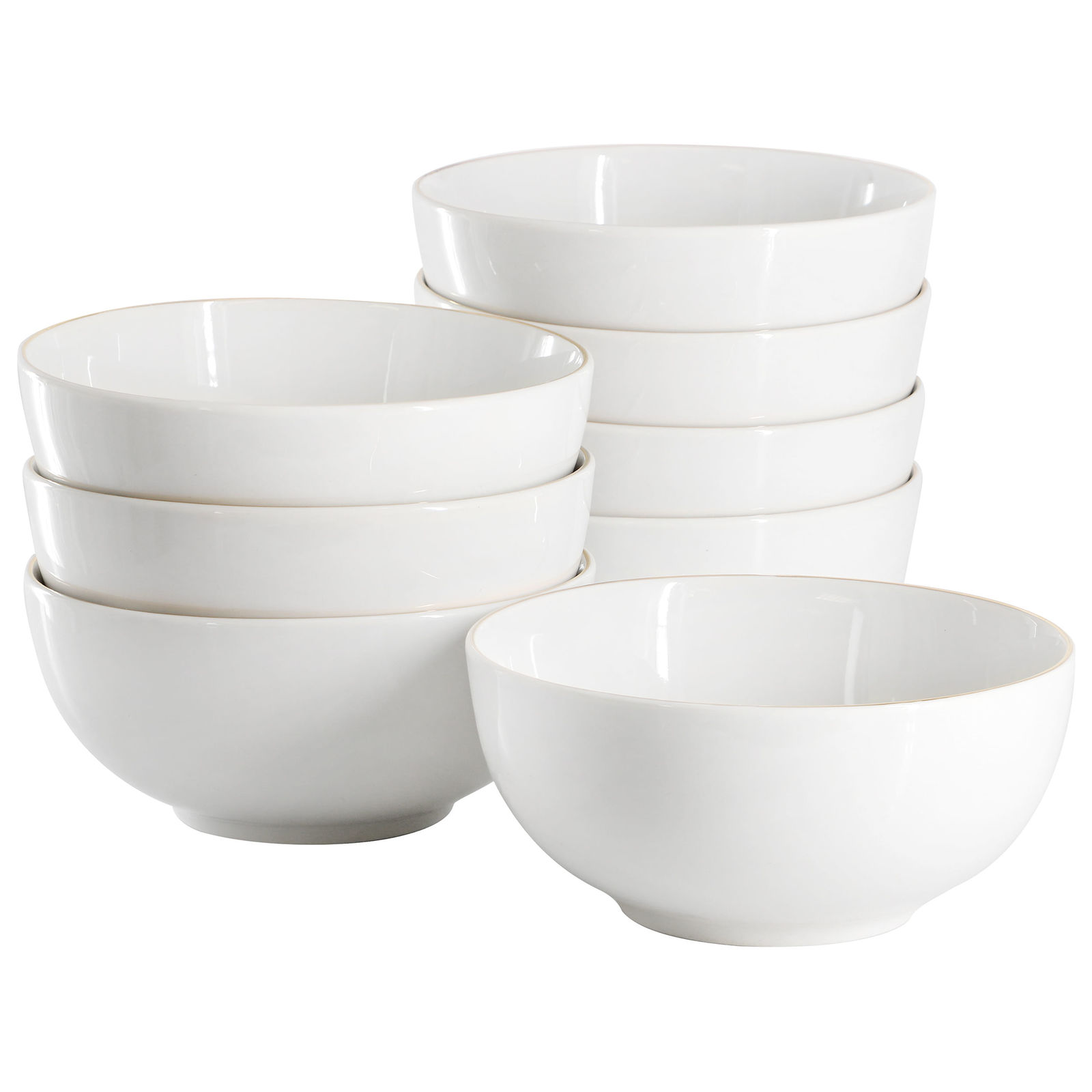 Elevate your everyday dining with the Gibson Home Ogalla 8 Piece Fine Ceramic 6 Inch Cereal Bowl Set in White with Gold Rim. Crafted from premium fine ceramic, this elegant set of eight cereal bowls features a classic white finish accented with a refined 1.5mm gold banding detail for a touch of luxury. Perfectly sized at 6 inches, these bowls are ideal for serving cereal, soups, desserts, and more, making them a versatile addition to your kitchen or dining room.