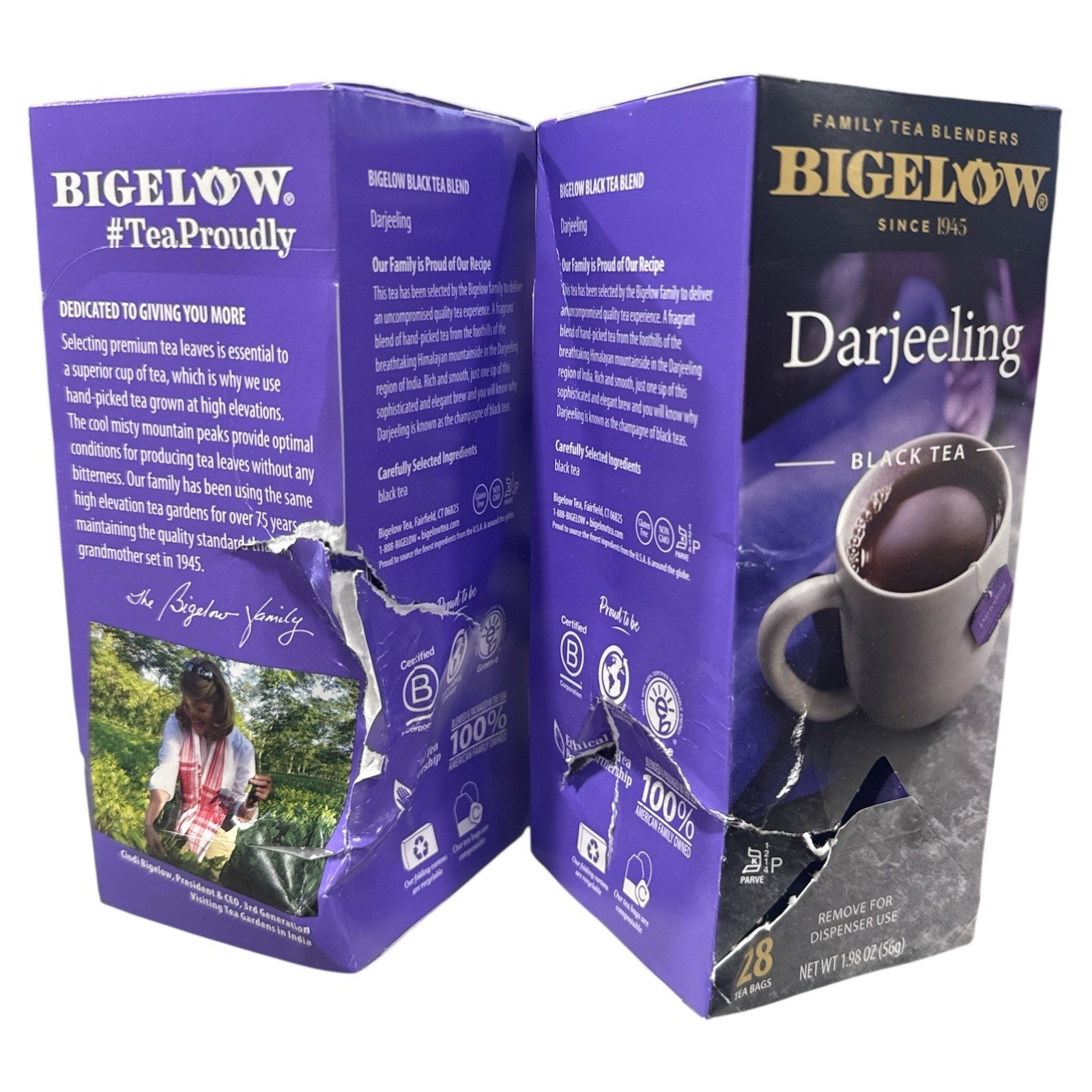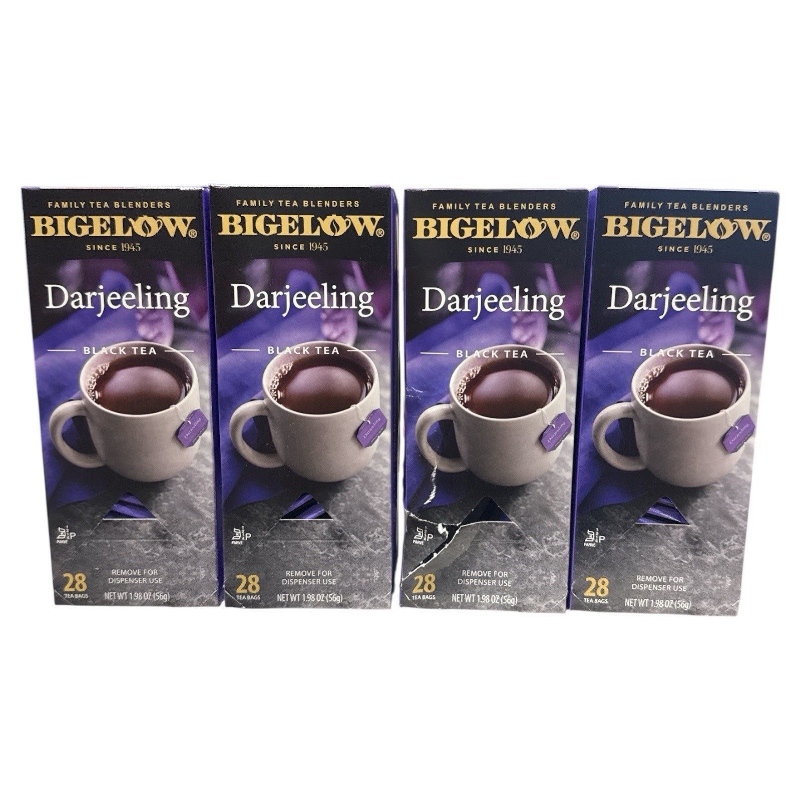 Two of the four boxes were partially crushed in shipping. See photo. Tea bags are unaffected.