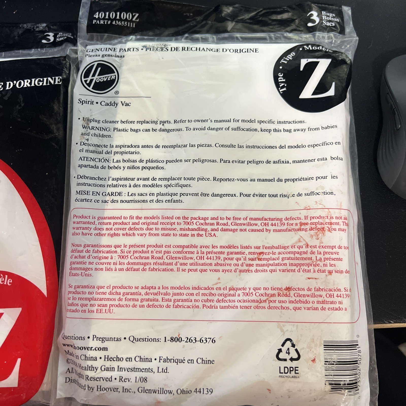 (2) Hoover Upright Vacuum Bags, Type Z, Allergen Filter 3 Bags Package 4010100Z