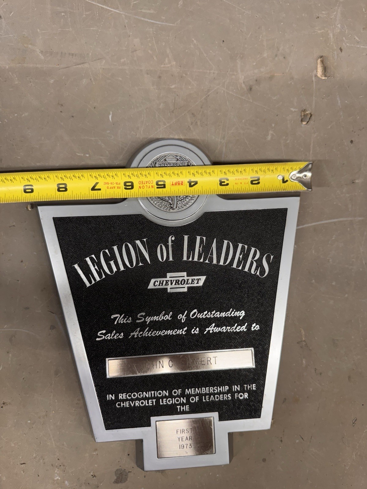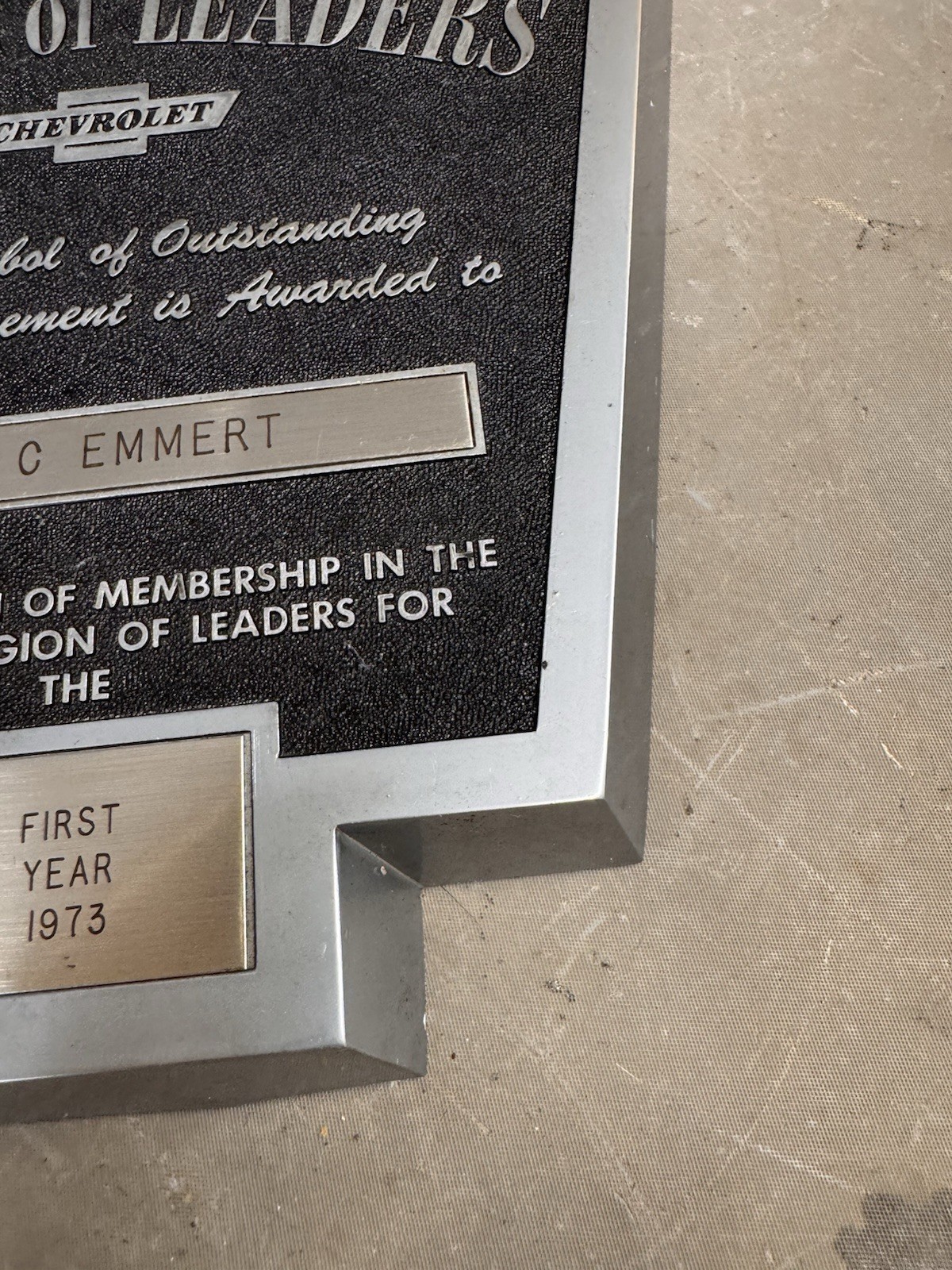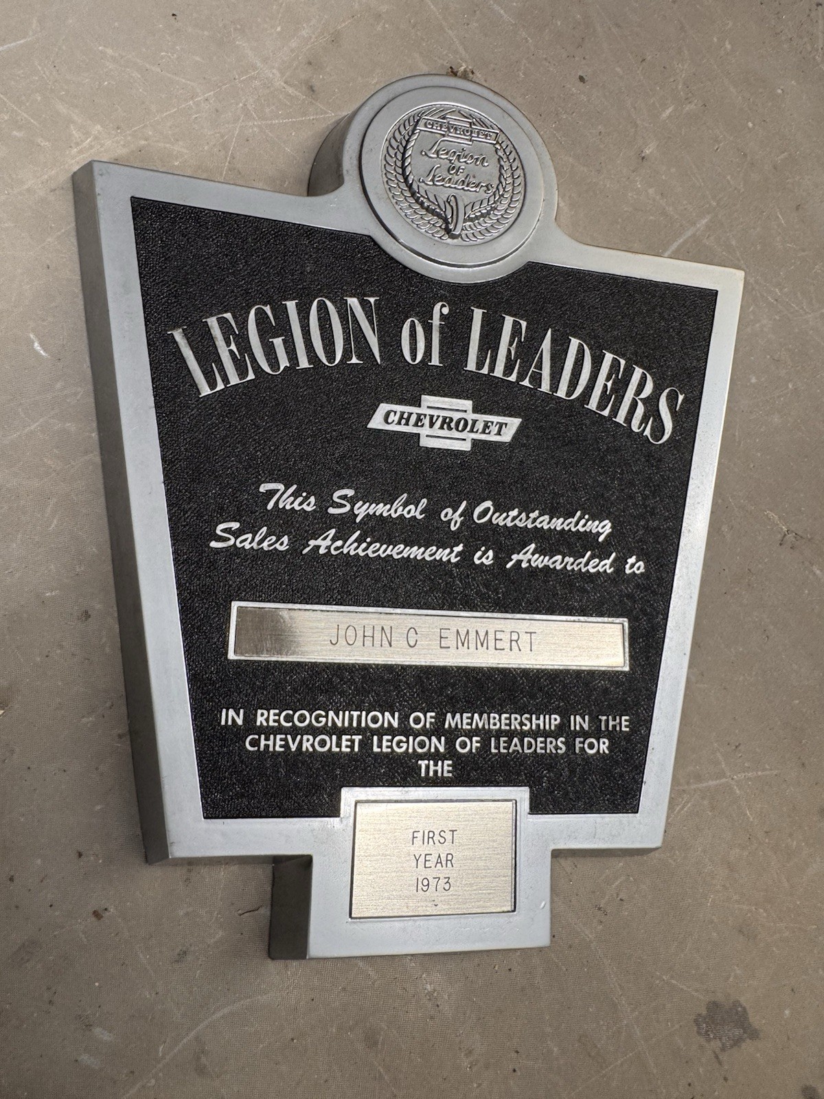 Vintage Chevrolet Legion of Leaders Dealer Sales Acheivement Award Plaque 1973