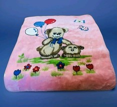 This vintage pink fleece baby blanket features an adorable teddy bear holding balloons and petting a small dog, perfect for your little one's nursery.