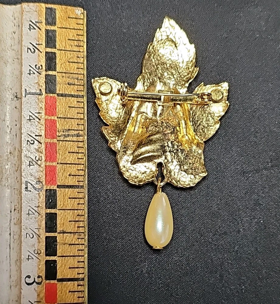 This stunning vintage brooch features an intricate gold-tone leaf design with beautifully detailed veining, giving it a lifelike, nature-inspired look. A single faux pearl teardrop dangles from the bottom, adding a touch of elegance and movement.