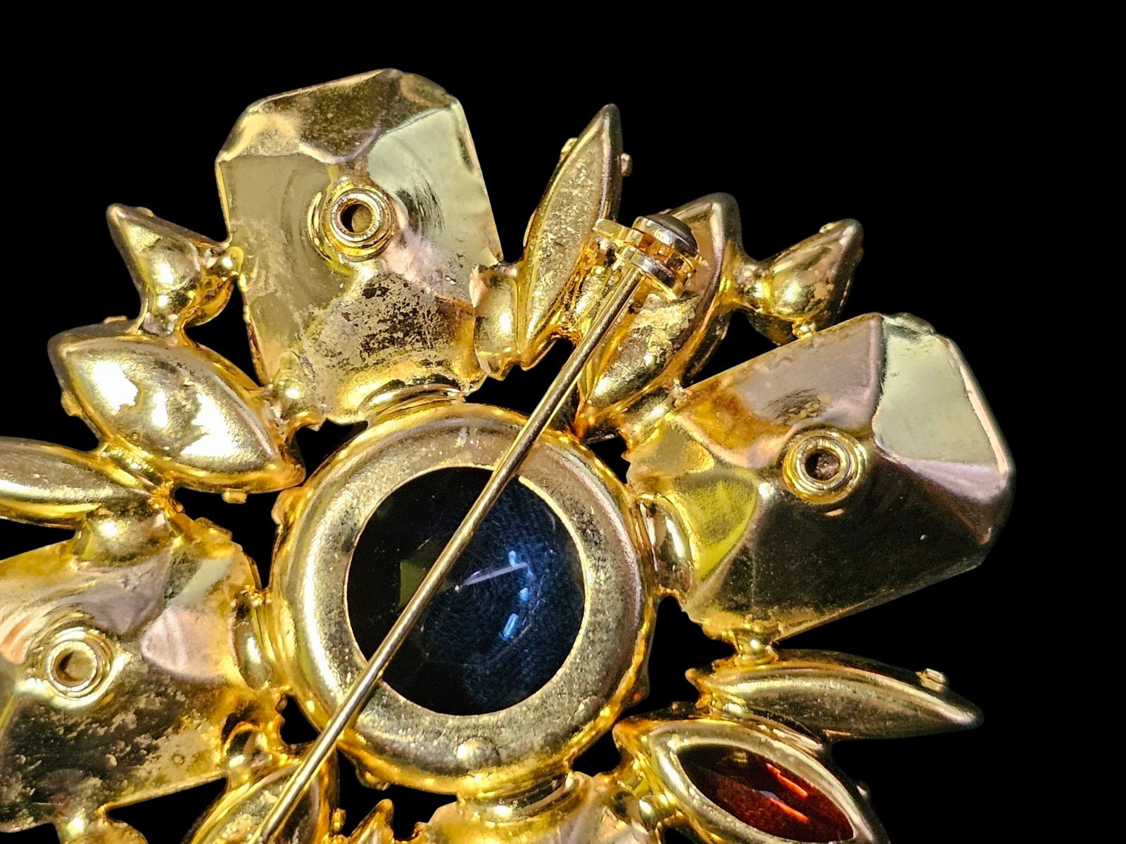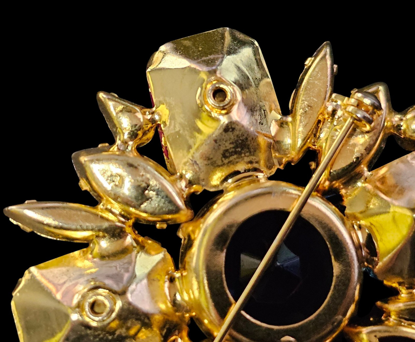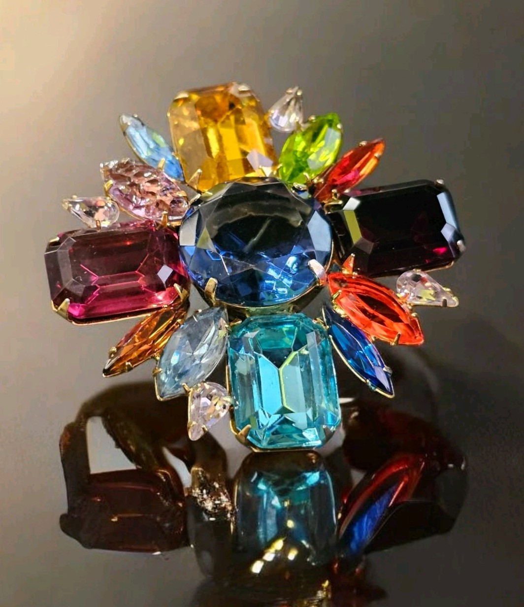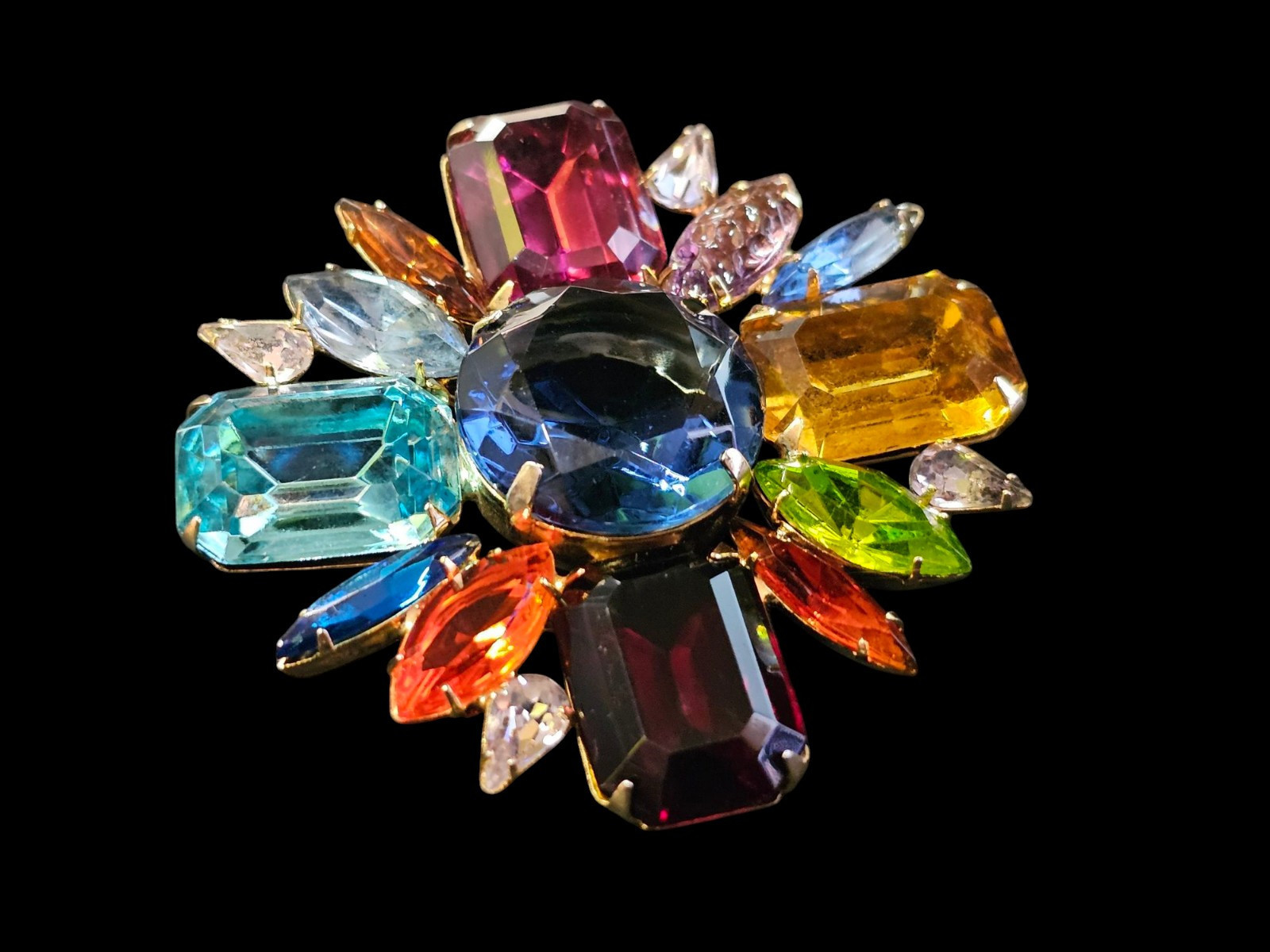 This exquisite and rare vintage brooch is a true statement piece, featuring a dazzling fruit salad-style design with multi-colored rhinestones in various cuts and vibrant hues. The combination of emerald, round, marquise, and baguette-cut stones creates a bold, dimensional effect, reminiscent of high-end mid-century costume jewelry from the 1950s-1960s.