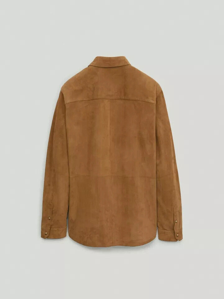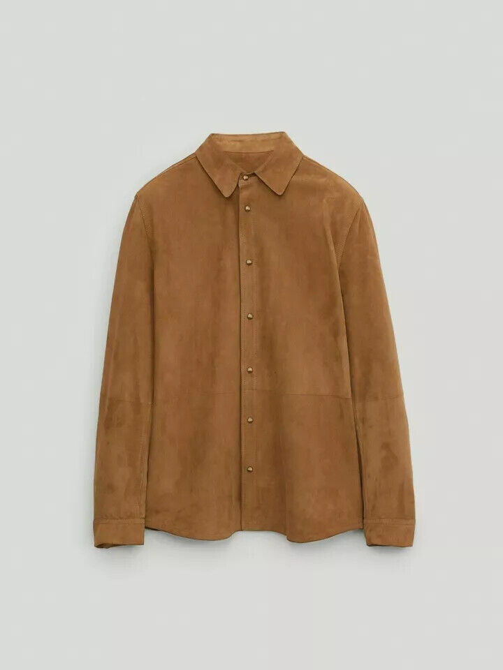 Camicia da uomo in morbida pelle scamosciata marrone fatta a mano elegante ca...