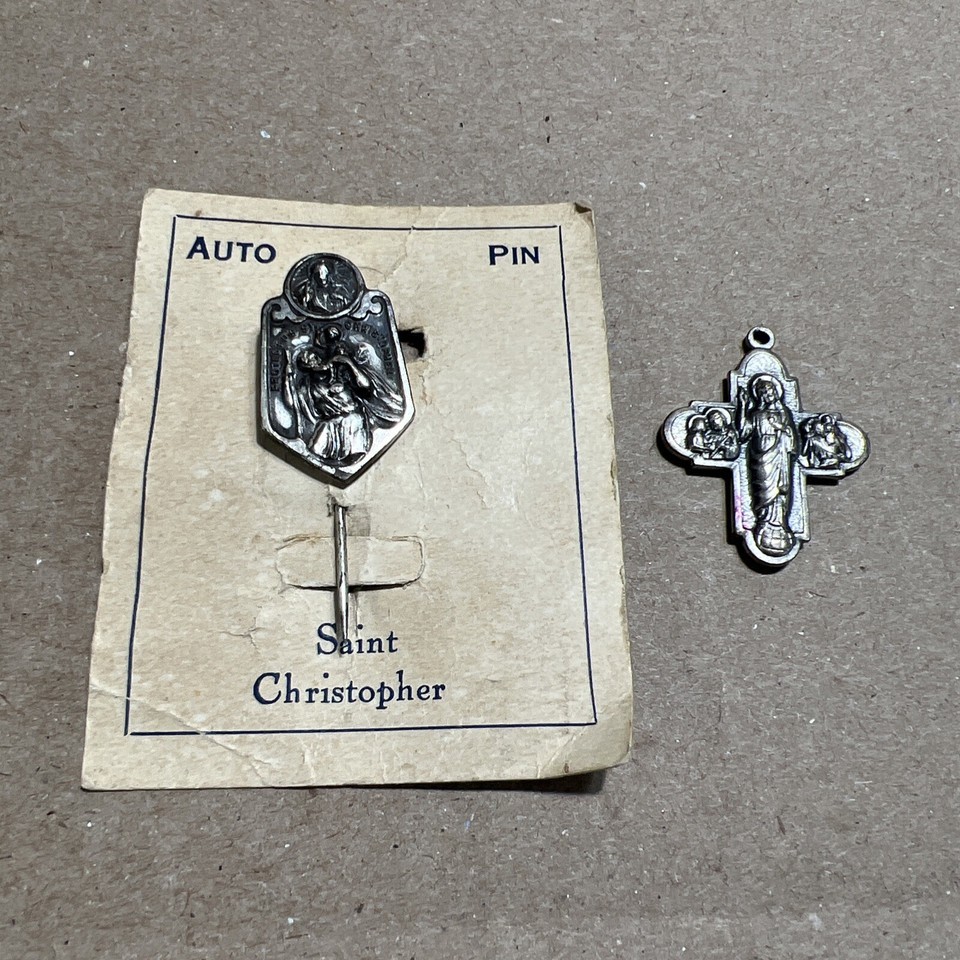 Vintage Saint Christopher Auto Pin & Sacred Heart Auto League Pendant