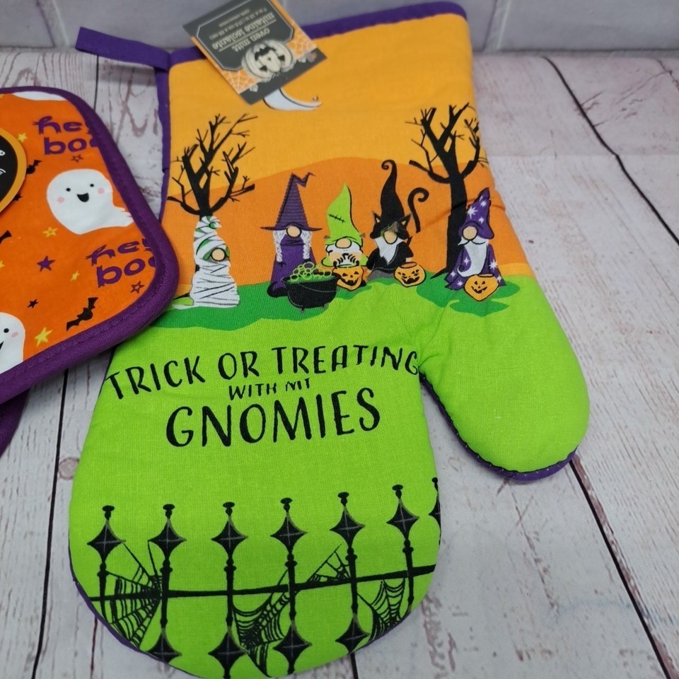 Halloween Ghost & Gnomes Kitchen 4pc Set - Towel, Pot Holders, Oven Mitt Orange