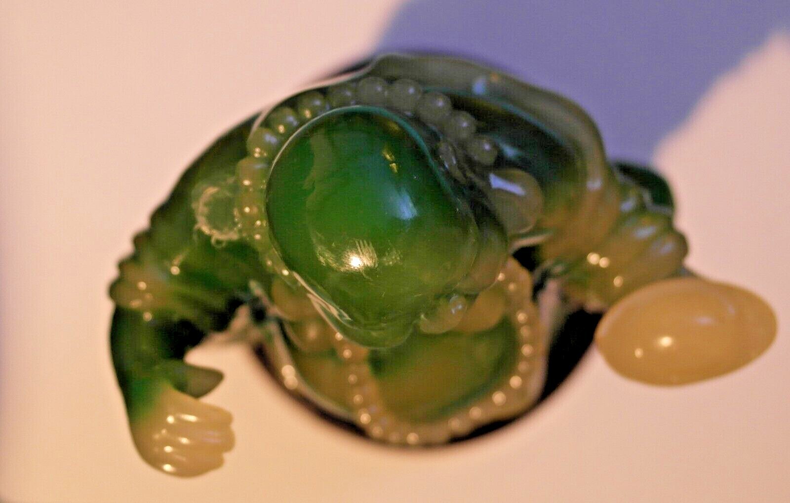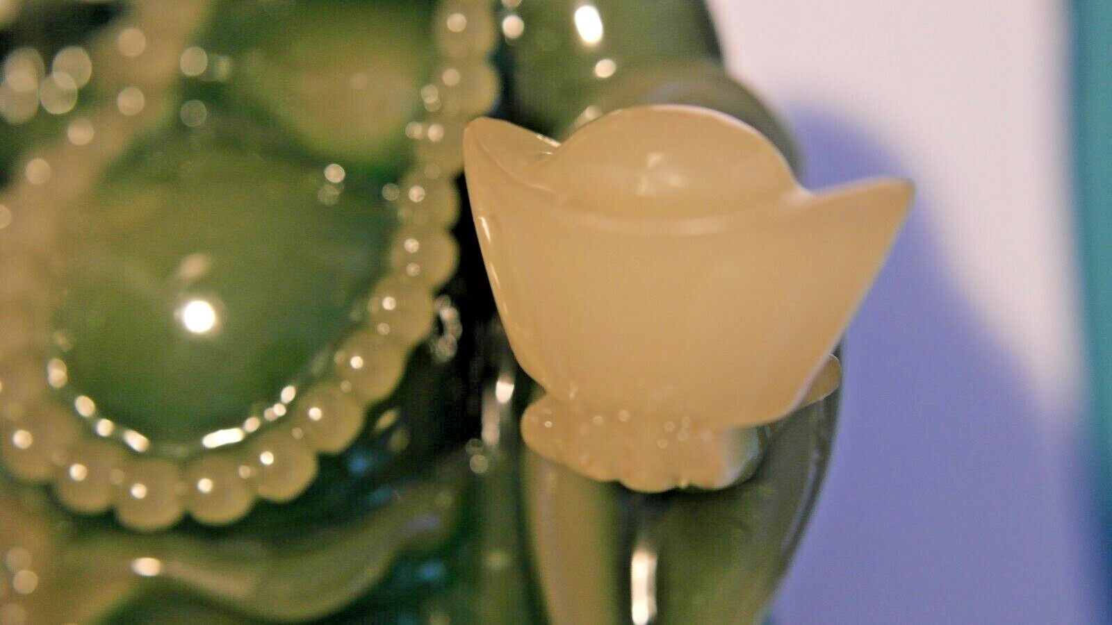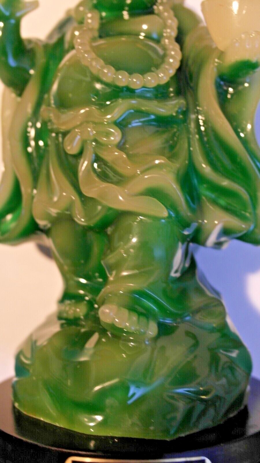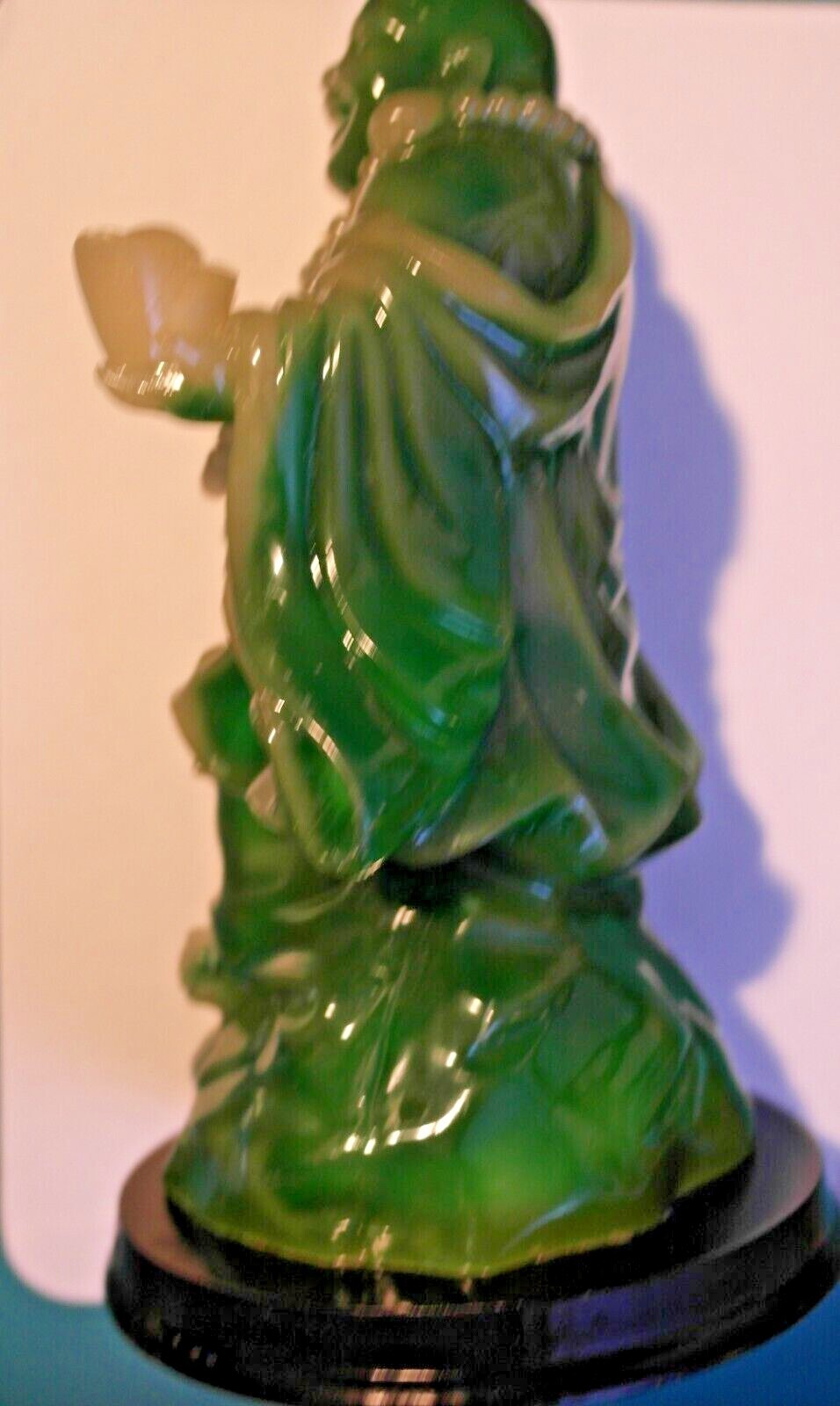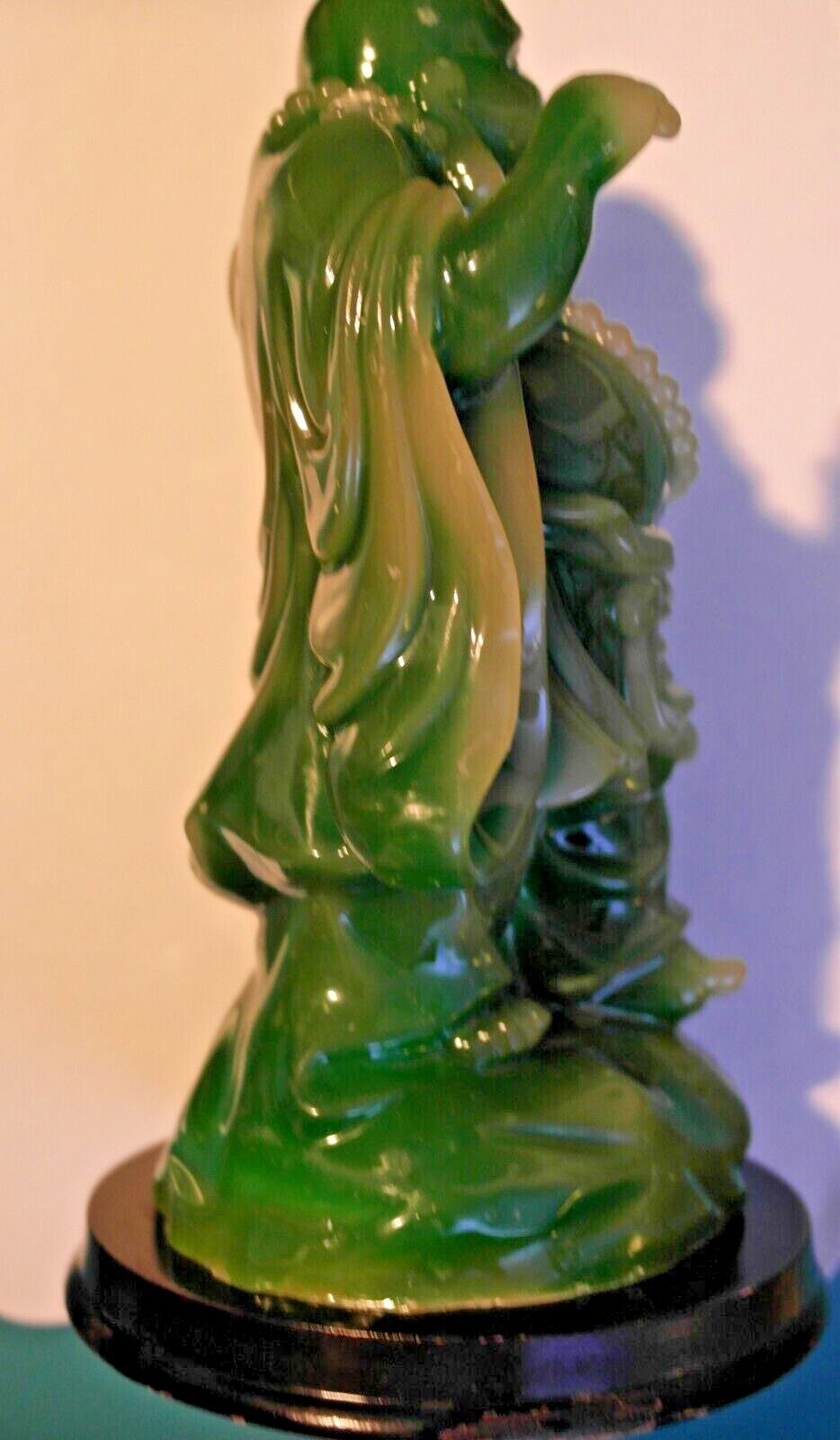 Very good used condition is as shown in the photographs of the actual statue. It is green and is made out of Resin. The size is 5.25" round base, height is 9" and the weight is about 3.5 lbs. The statue is clean with no cuts, breaks, scratches, etc. It has a wooden base. Reasonable offers will be appreciated.